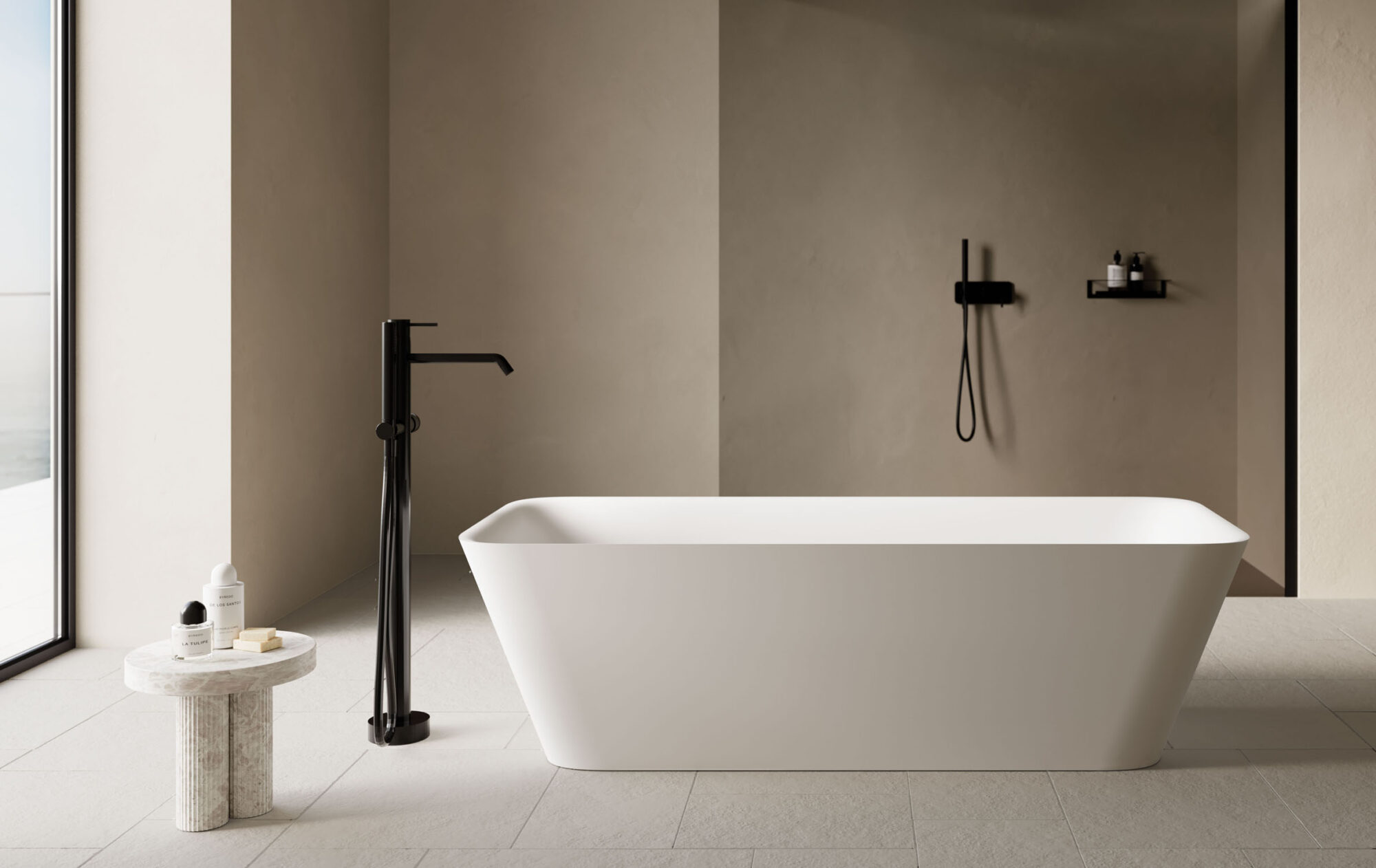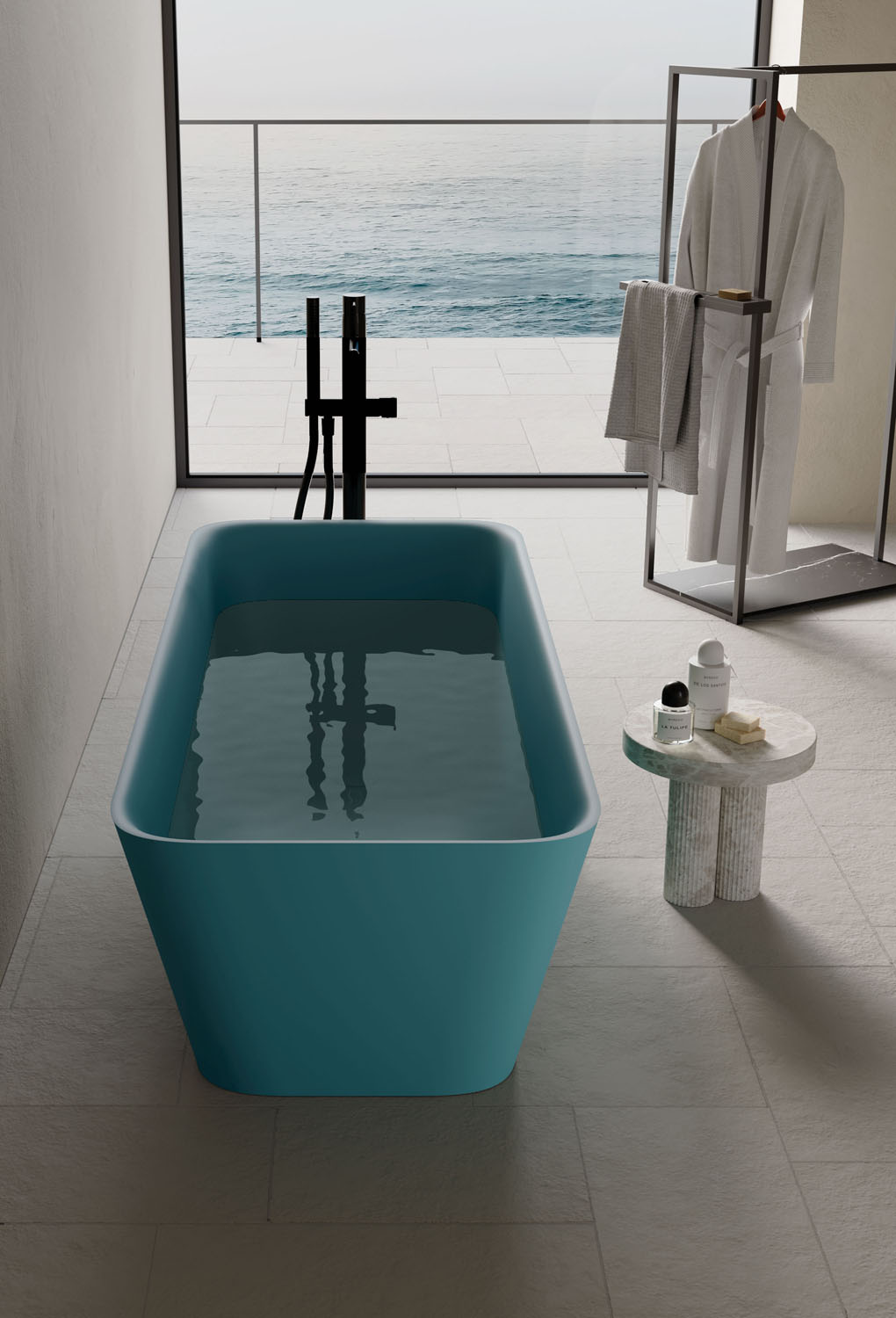 Die freistehende Badewanne Equal besticht durch ihre markante rechteckige Form. Sie ist aus Aquatek Light in Bianco matt hergestellt und kann außen oder auch innen in allen matten Lackfarben von Ideagroup oder RAL-/NCS-Farben lackiert werden. Überlauf in die Badewanne integriert. Mit farblich passendem Ablaufdeckel.