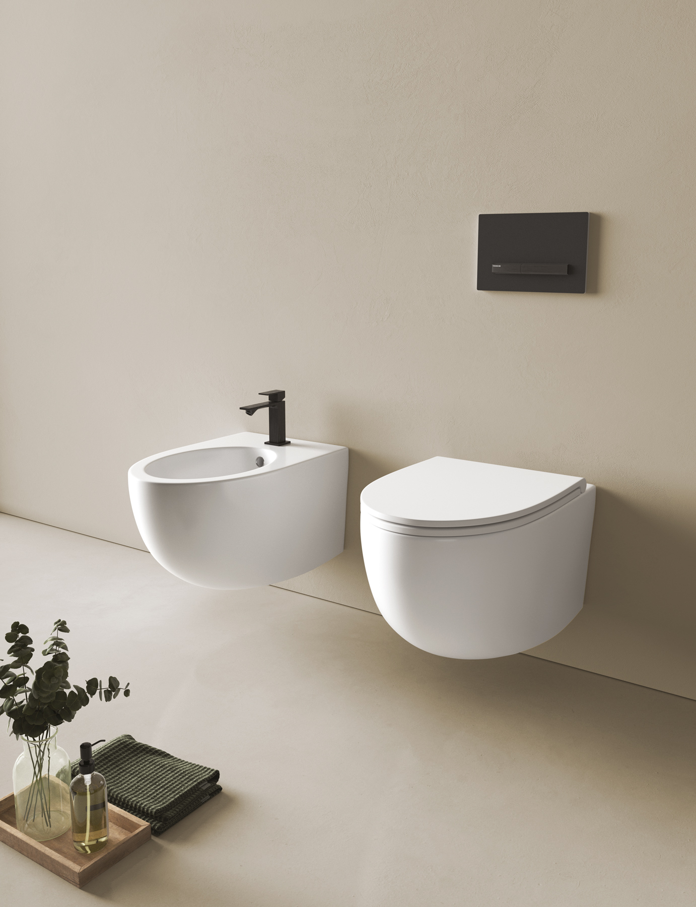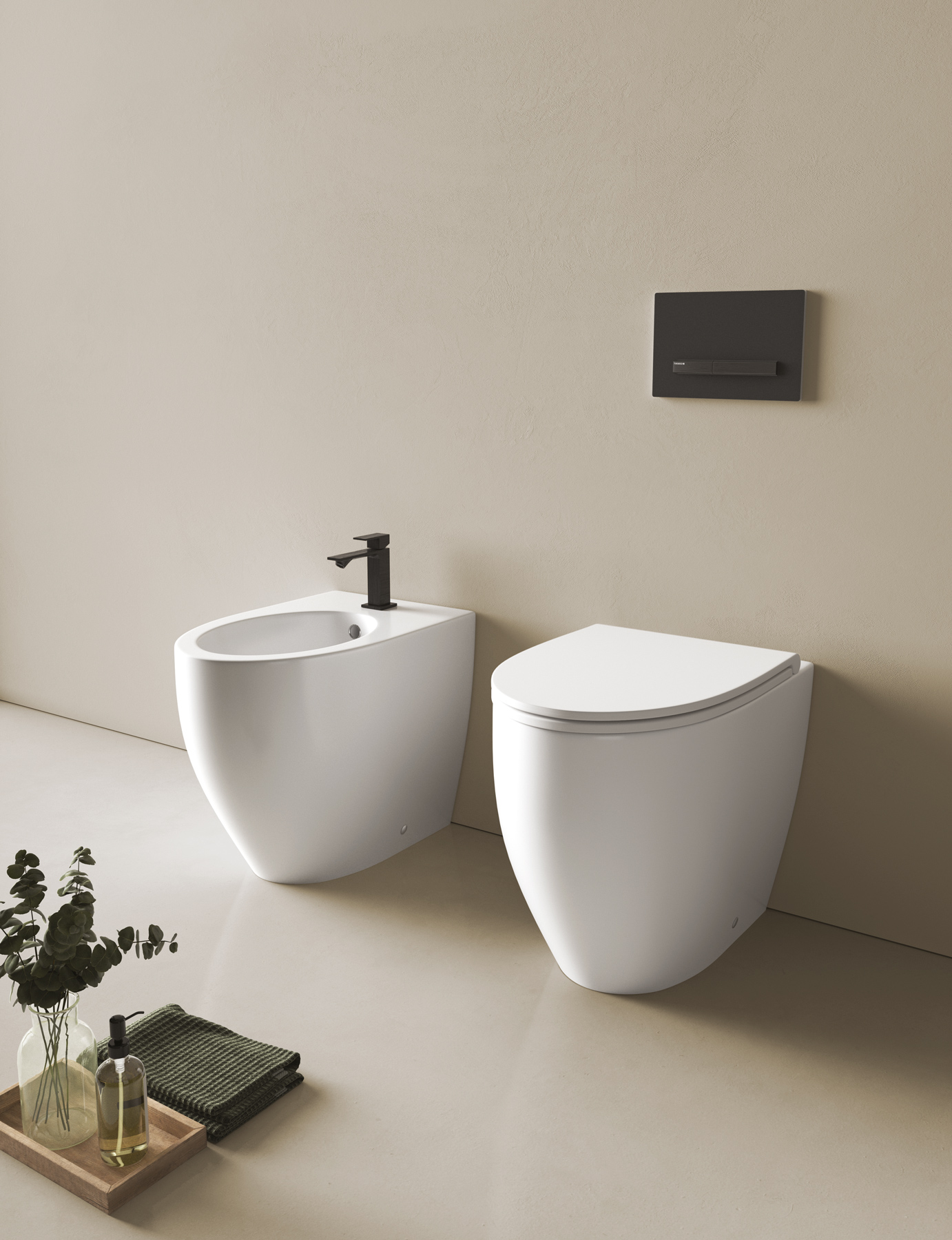 Kompakte oder geschwungene Formen prägen das Aussehen von Bob, der wandhängenden oder bodenstehenden Sanitärkeramik in Bianco matt.