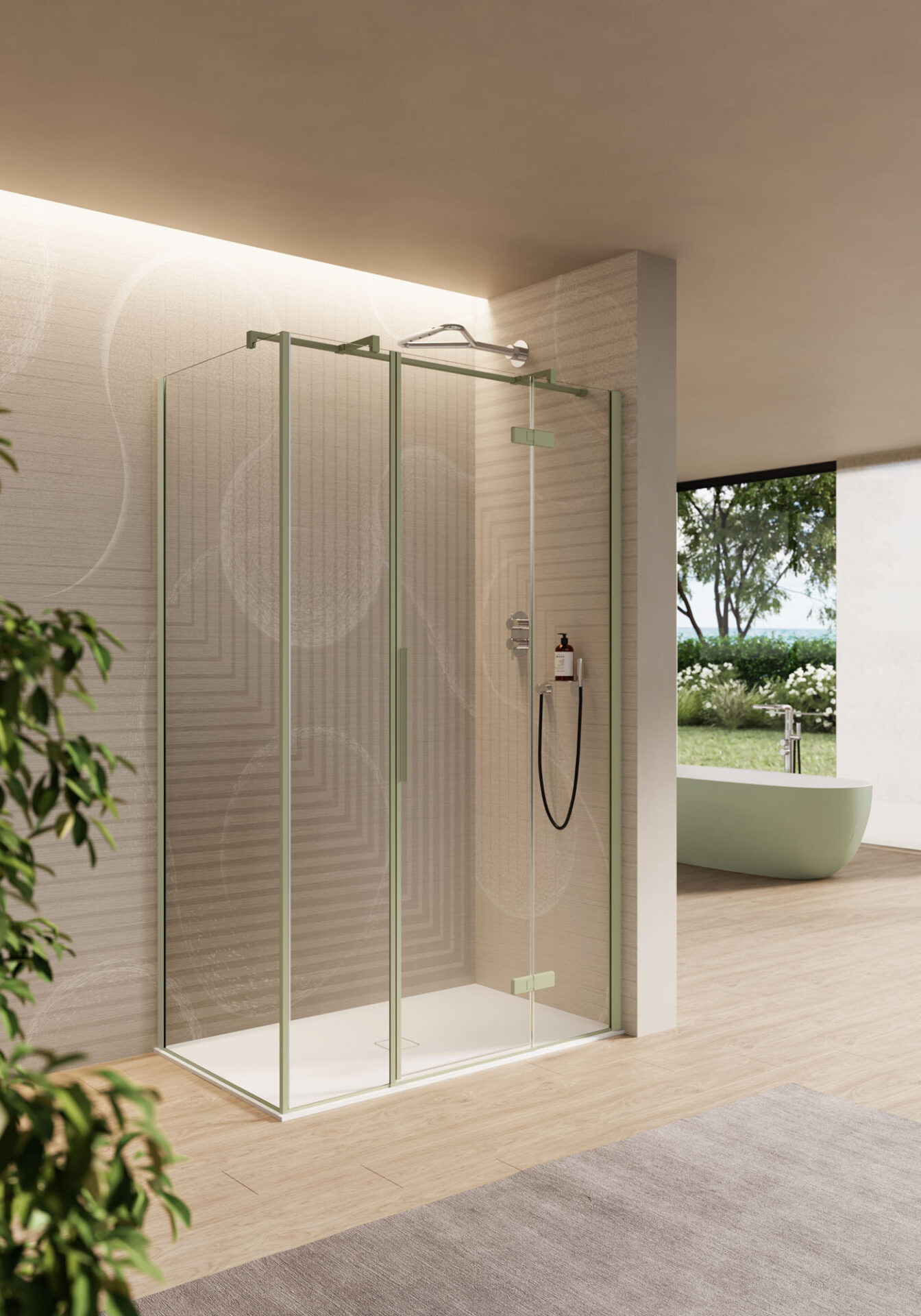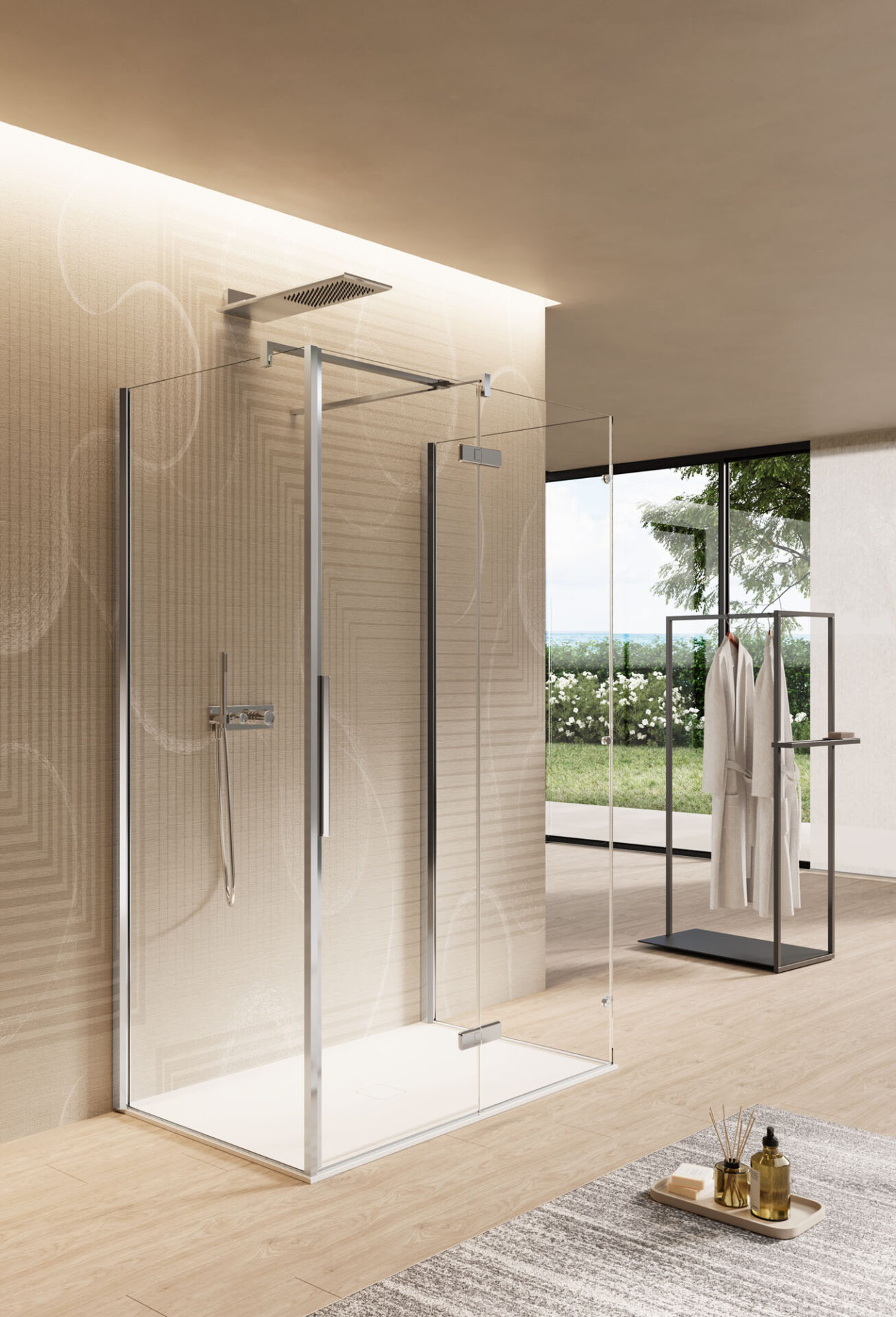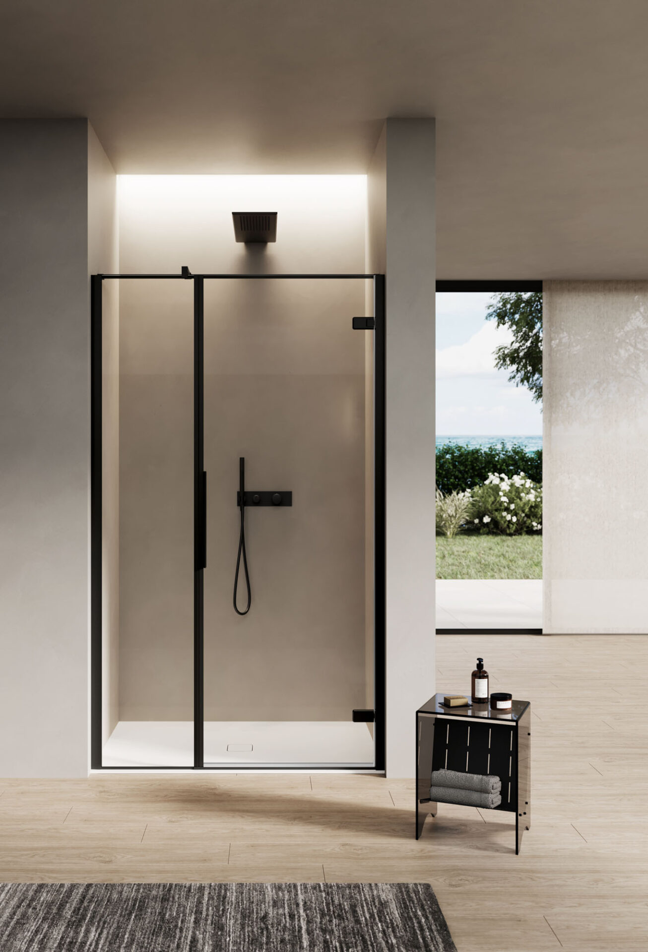 Ines ist eine Duschkabine mit Drehtür im minimalistischen Stil, die in der Nische, in der Ecke, an der Wand. Der in das Profil mit integriertem Griff erweist sich bei der täglichen Reinigung als praktisches und funktionales Element.