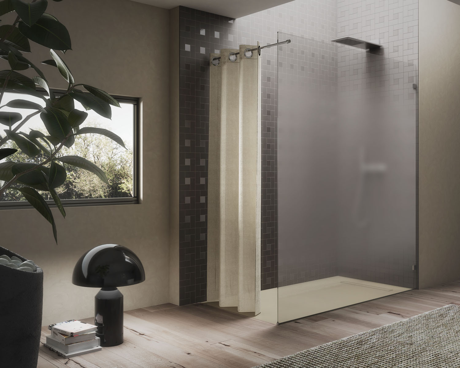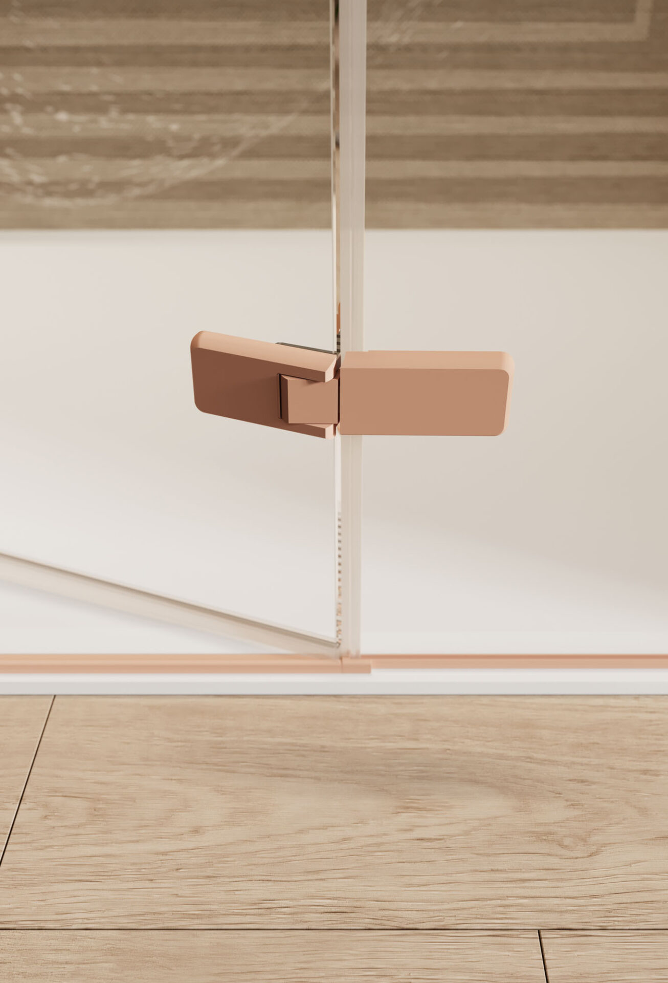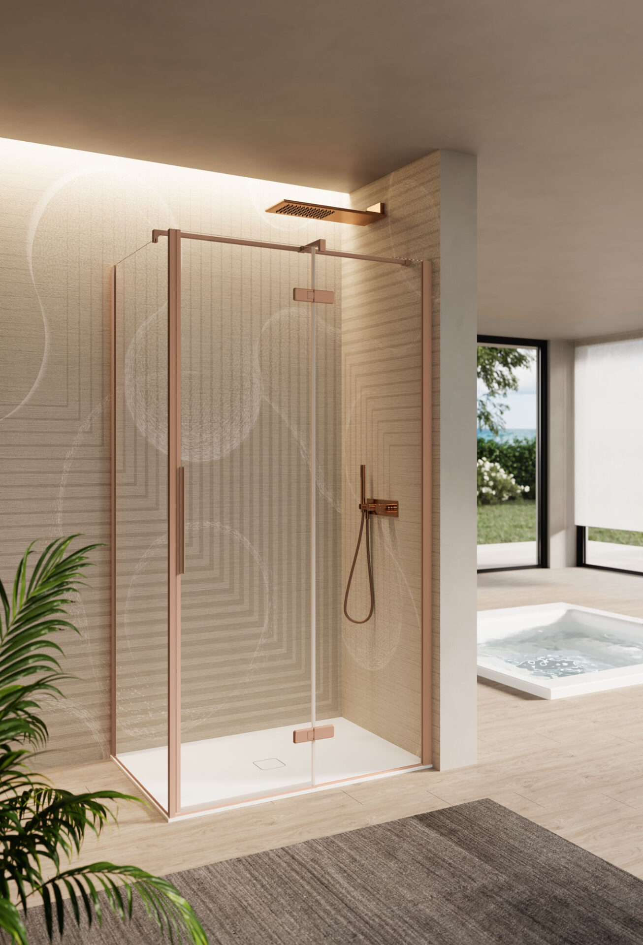Ines ist eine Duschkabine mit Drehtür im minimalistischen Stil, die in der Nische, in der Ecke, an der Wand. Der in das Profil mit integriertem Griff erweist sich bei der täglichen Reinigung als praktisches und funktionales Element.
