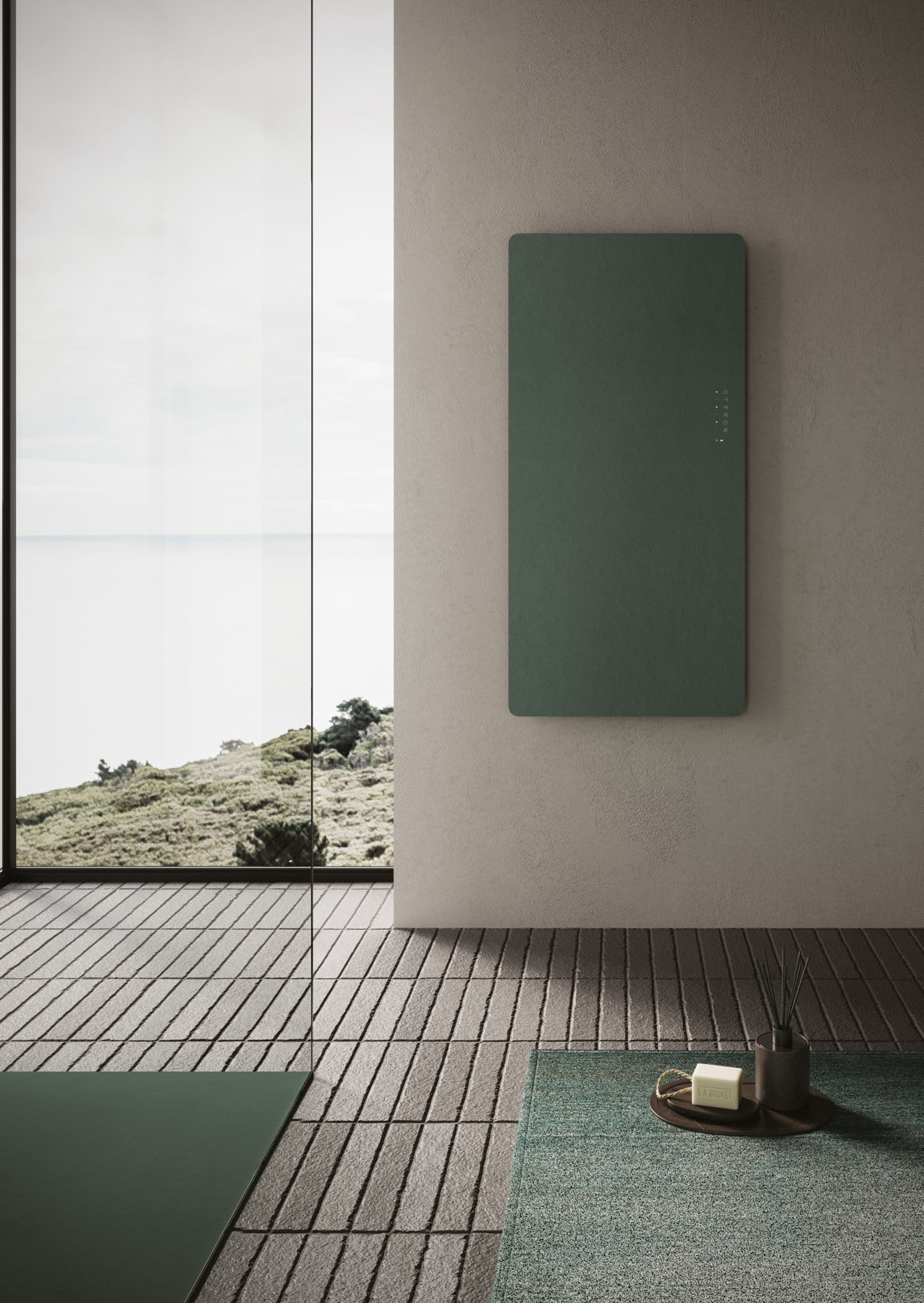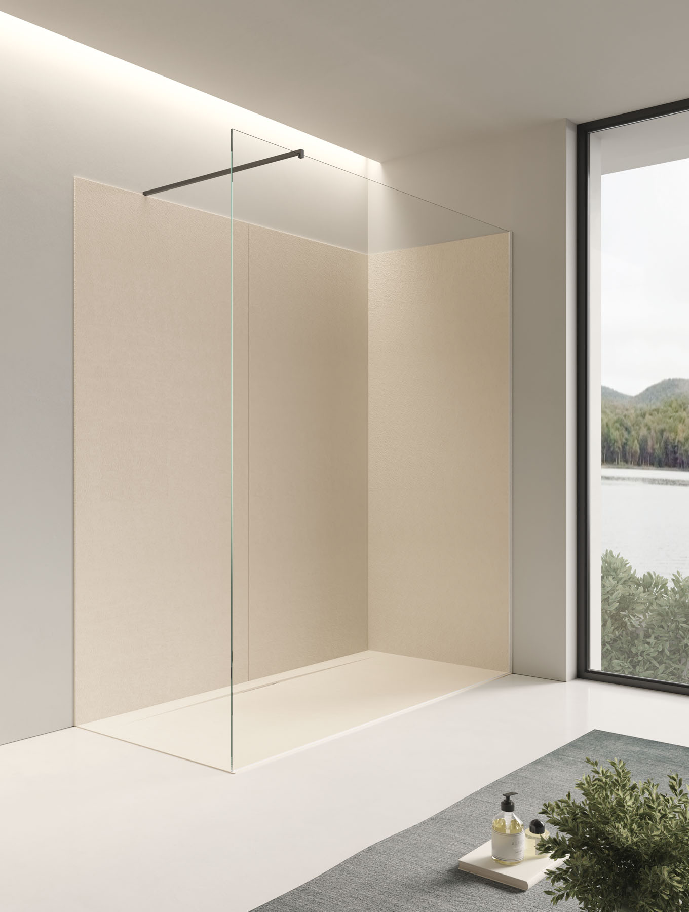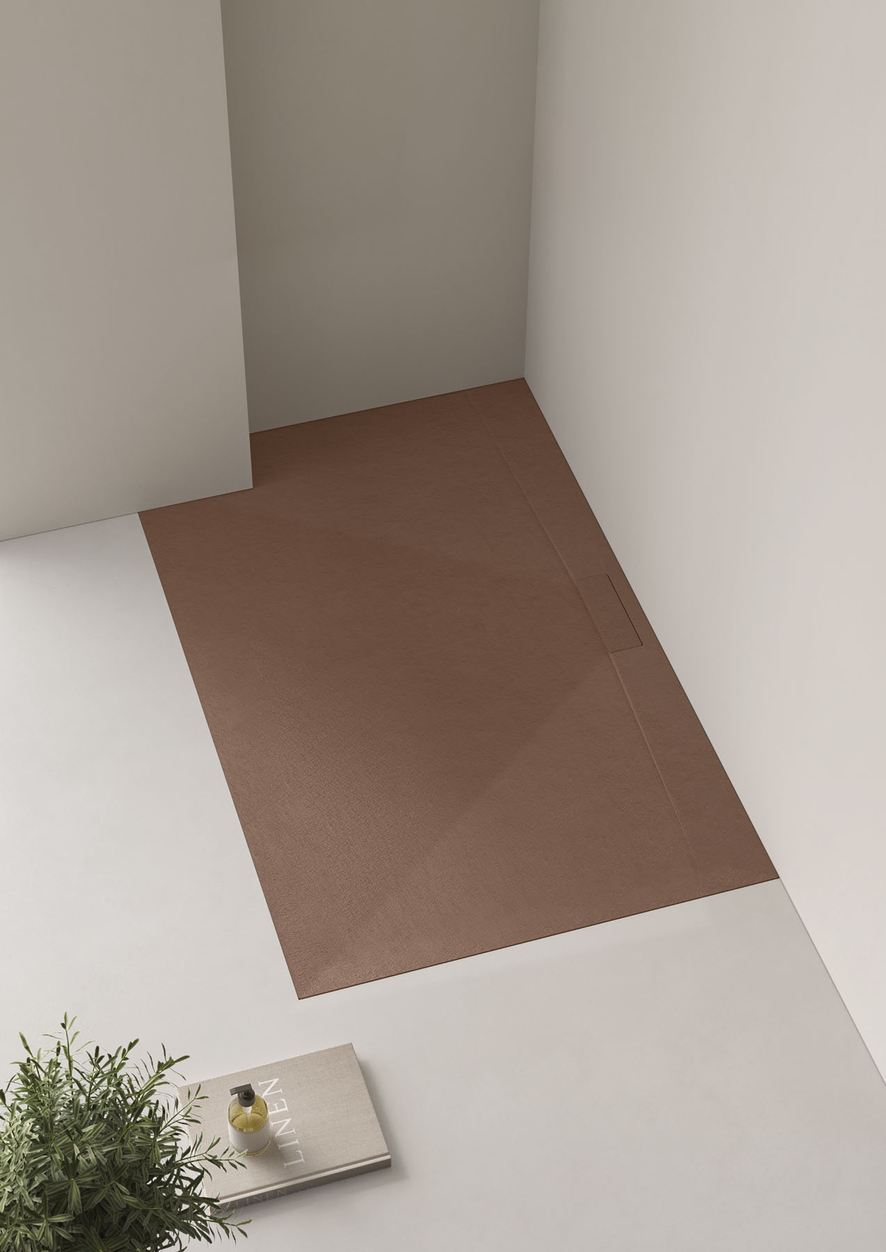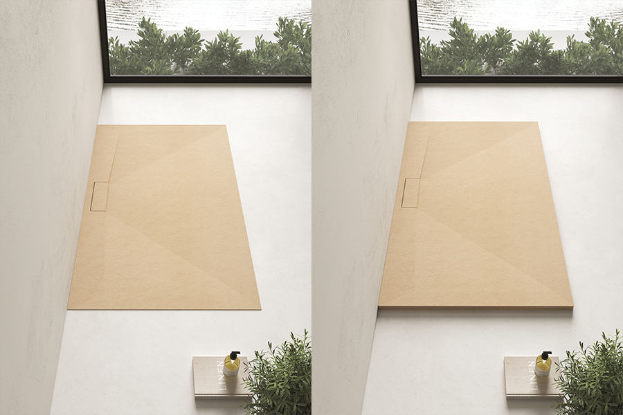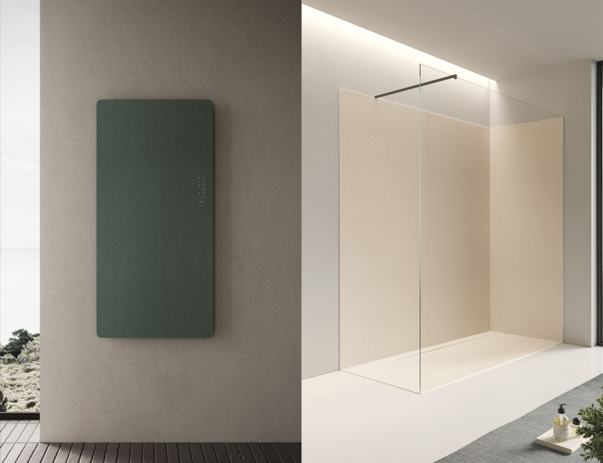 Die Duschwanne Dual kann mit dem Designheizkörper Helios in der gleichen Textur kombiniert werden. Material und Ausführung können auch an den Wänden fortgesetzt werden.
