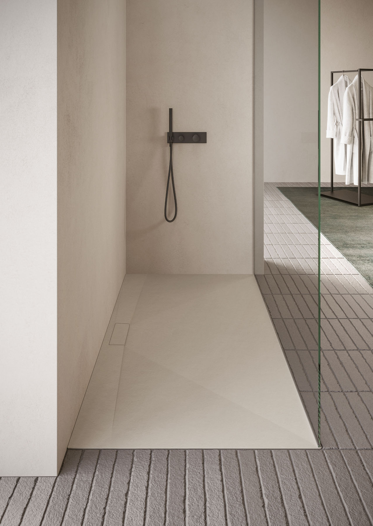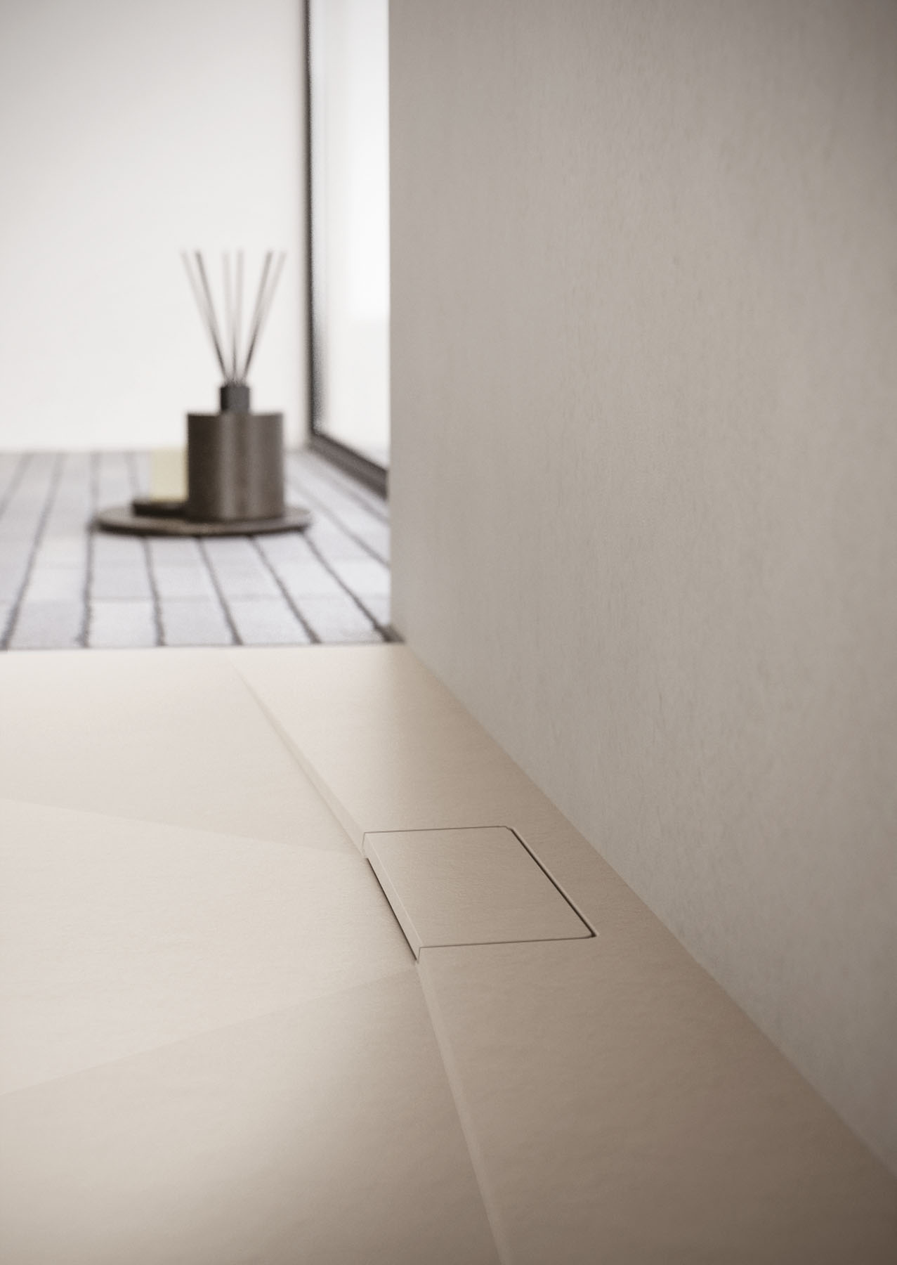 Bei der Duschwanne Dual aus Tecnogel wird das Material zu einem funktionalen und dekorativen Element, das sich angenehm anfühlt. Der Ablauf in der gleichen Ausführung verläuft der Länge nach in der Duschwanne.