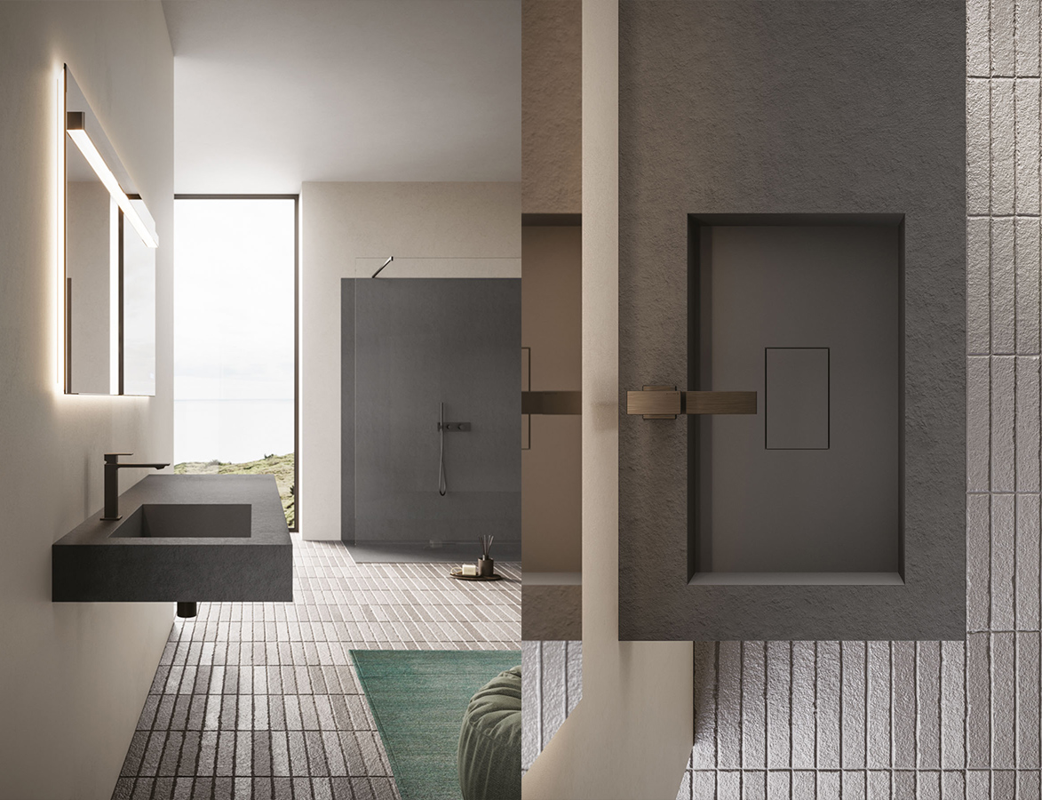 Die Waschtischplatte mit integriertem Waschbecken ist in der gleichen Ausführung und in der Textur der Duschwanne erhältlich.
