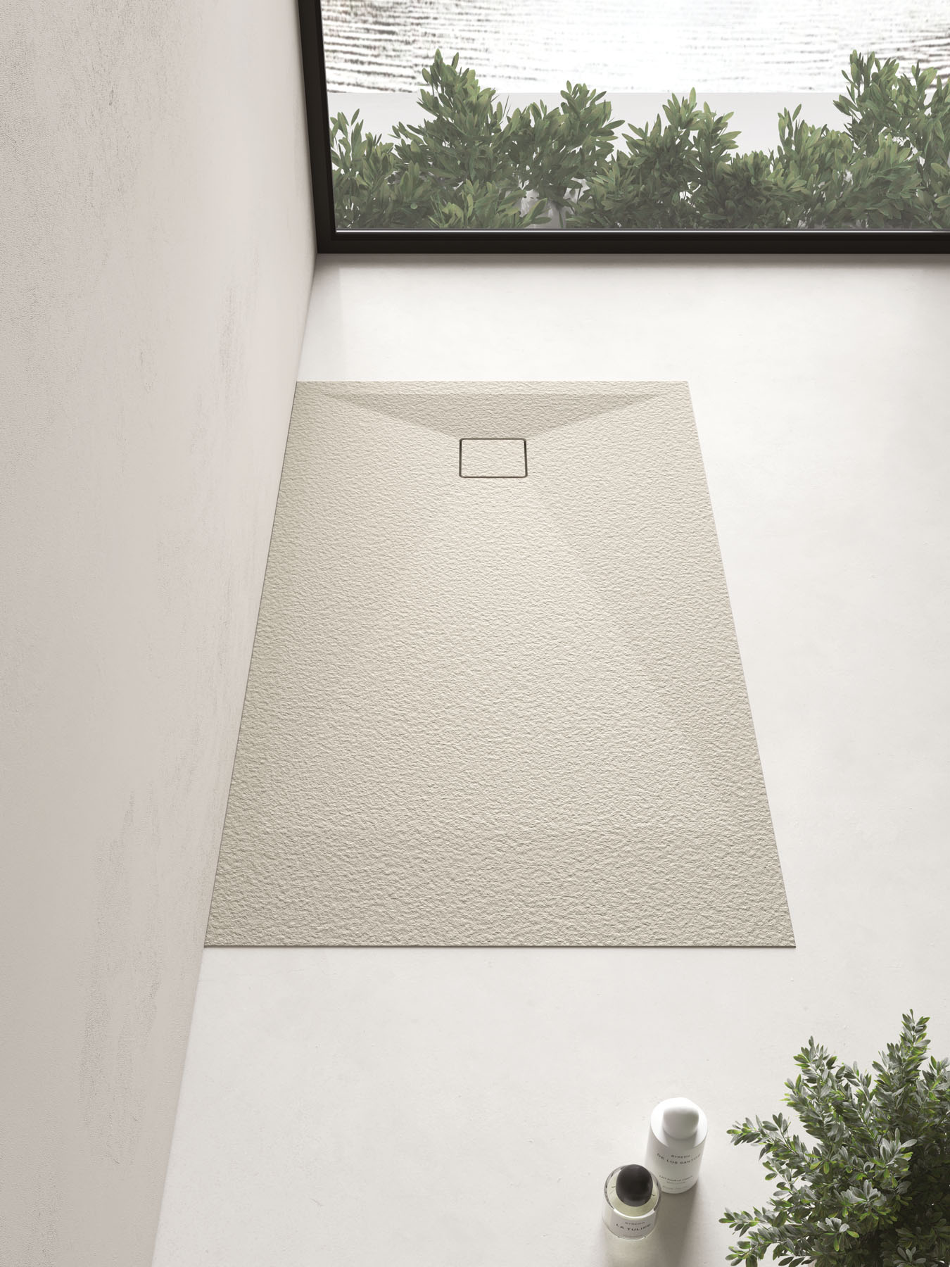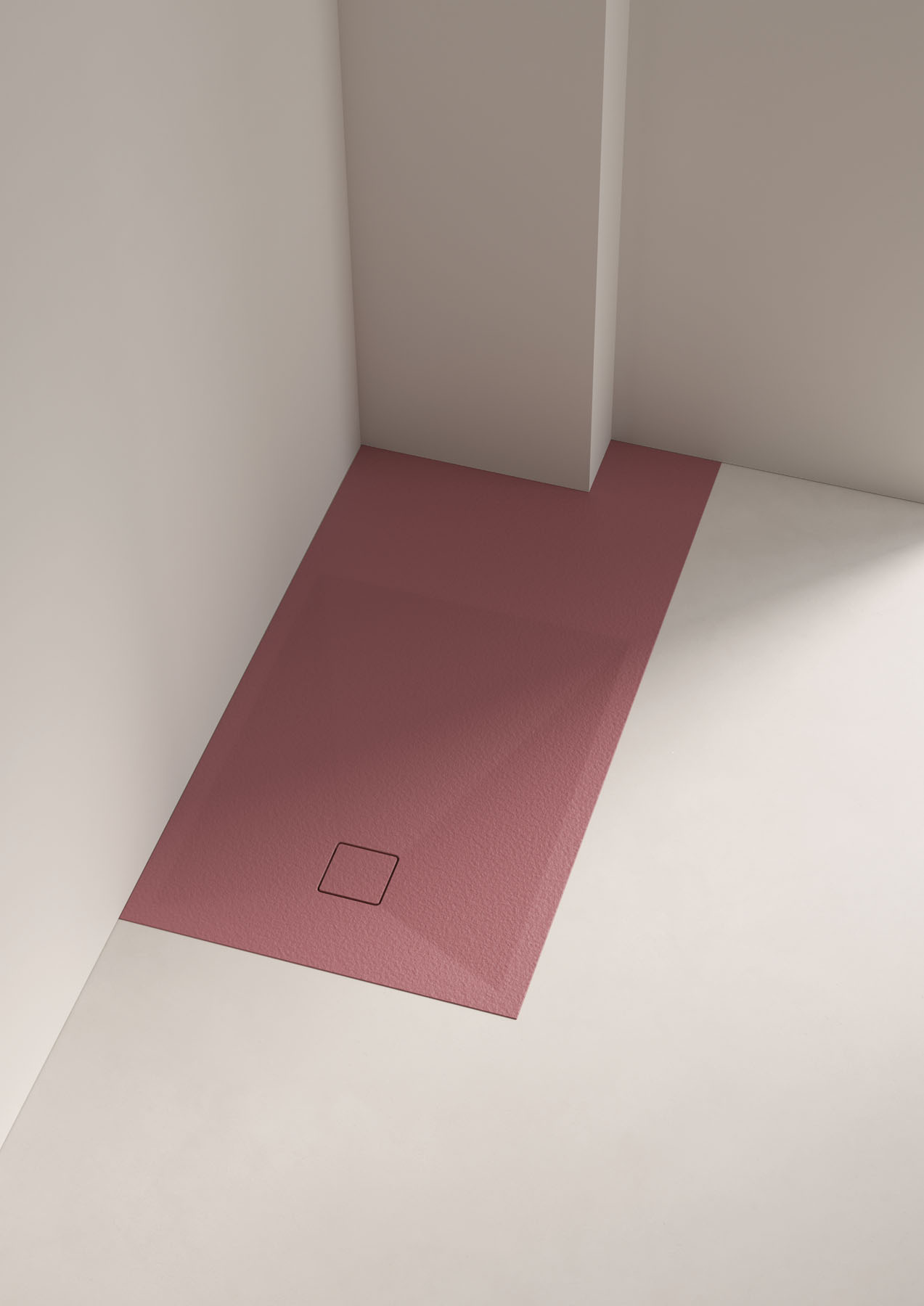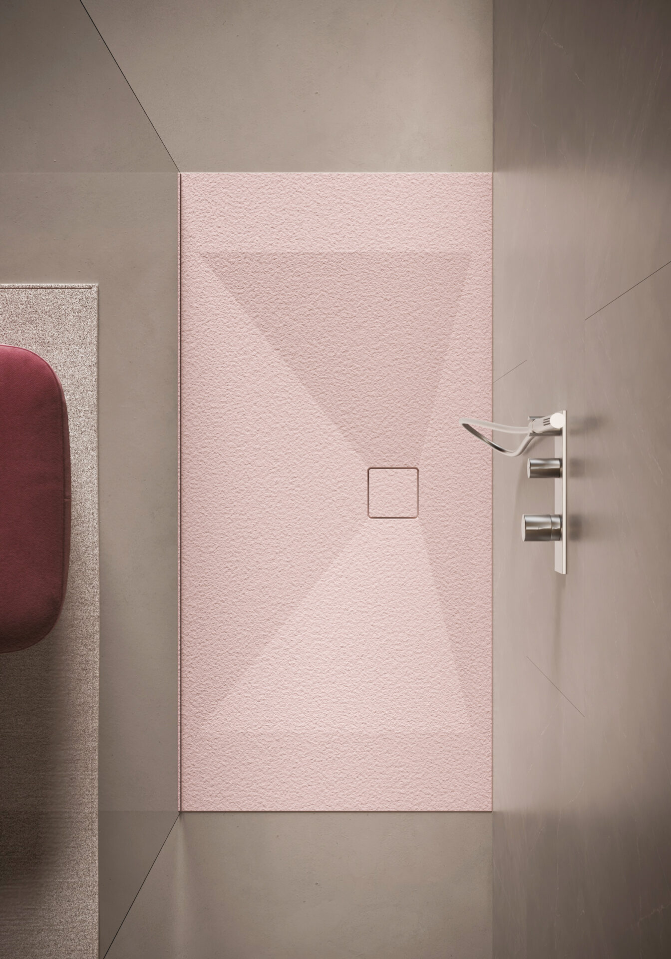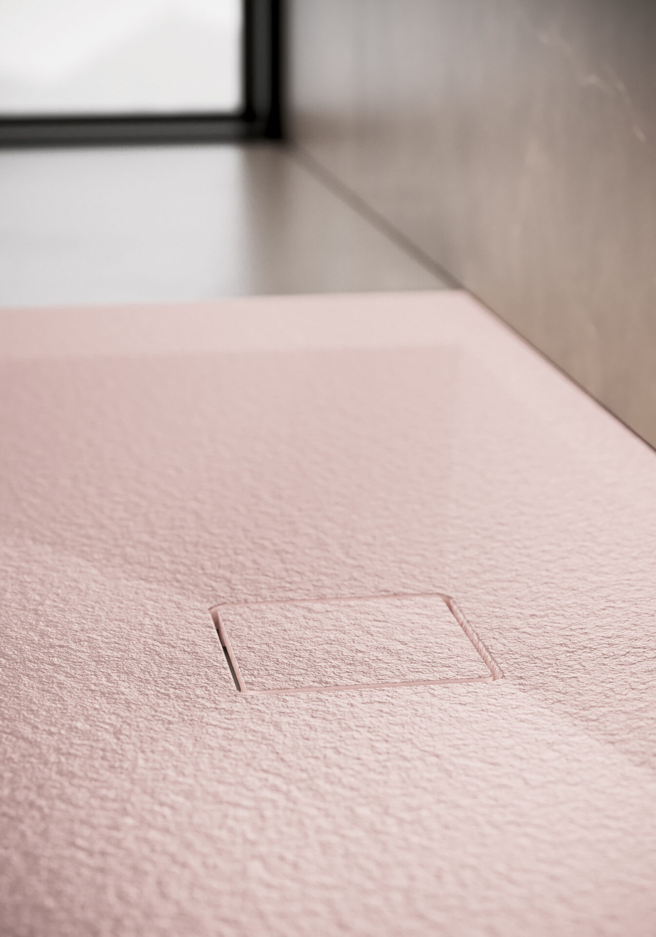 Die spezielle Textur der Duschwanne Join passt sich unterschiedlichsten Planungsanforderungen an. Sie ist bodengleich oder erhöht in zahlreichen Ausführungen erhältlich. Dieses Modell kann maßgefertigt werden. Der farblich passende Ablauf befindet sich an der Breitseite der Duschwanne.