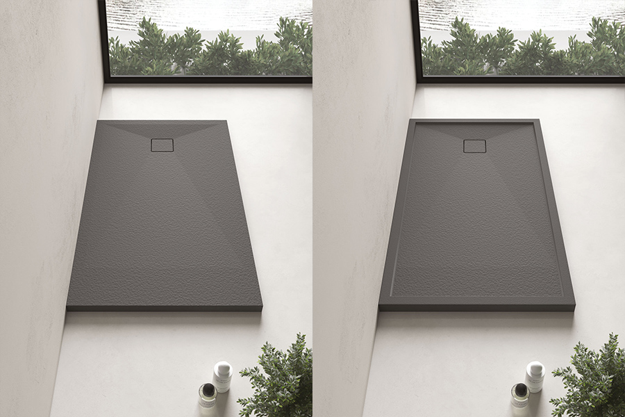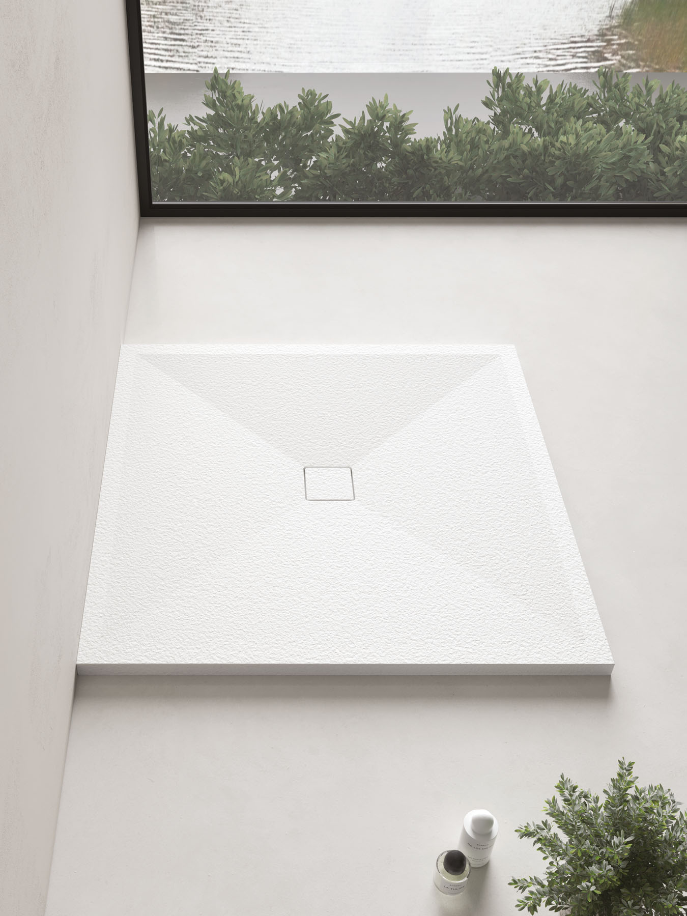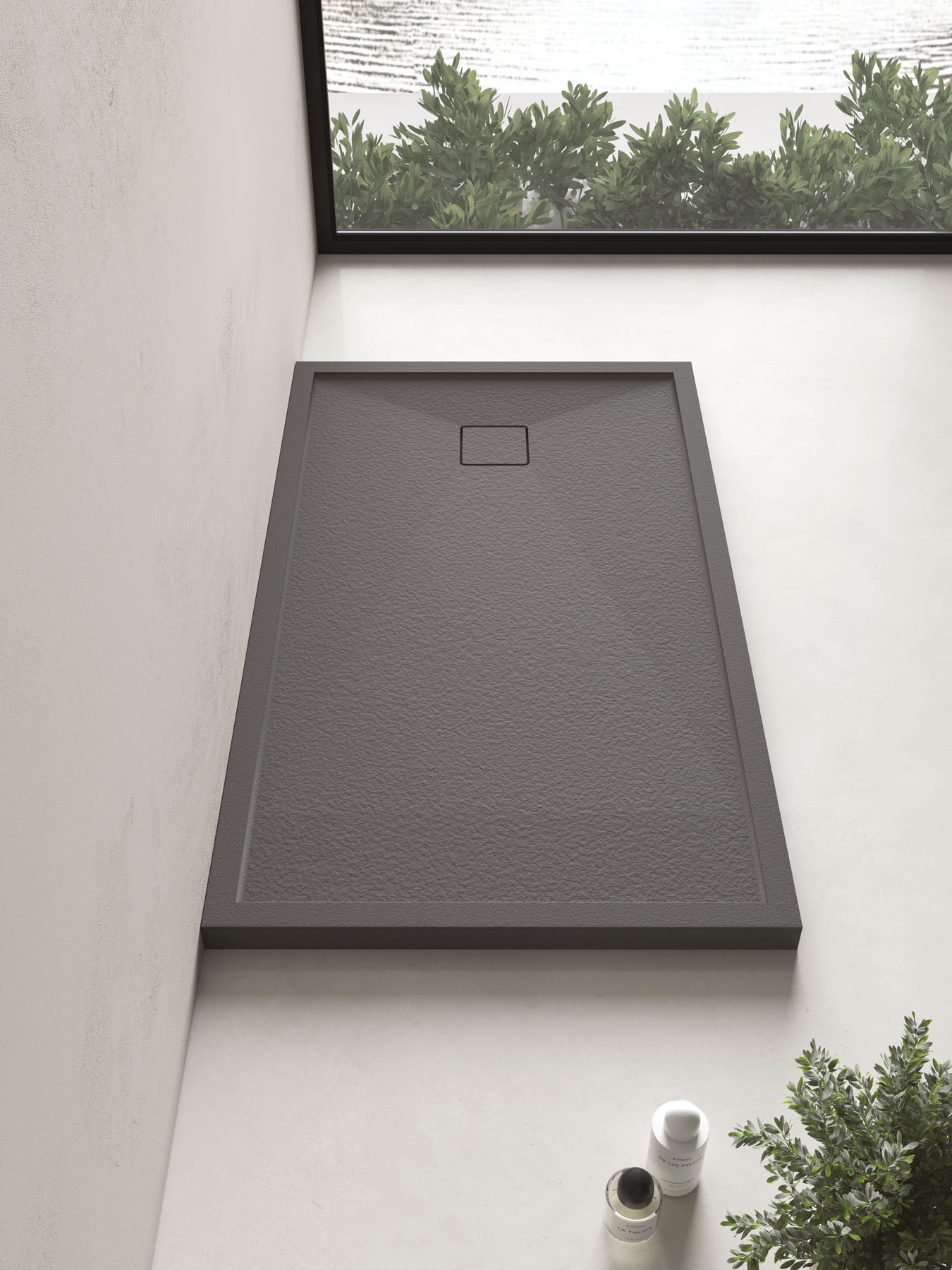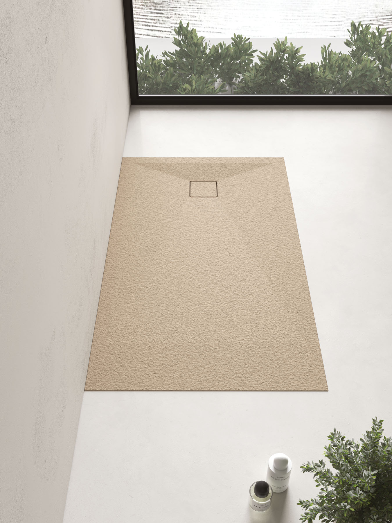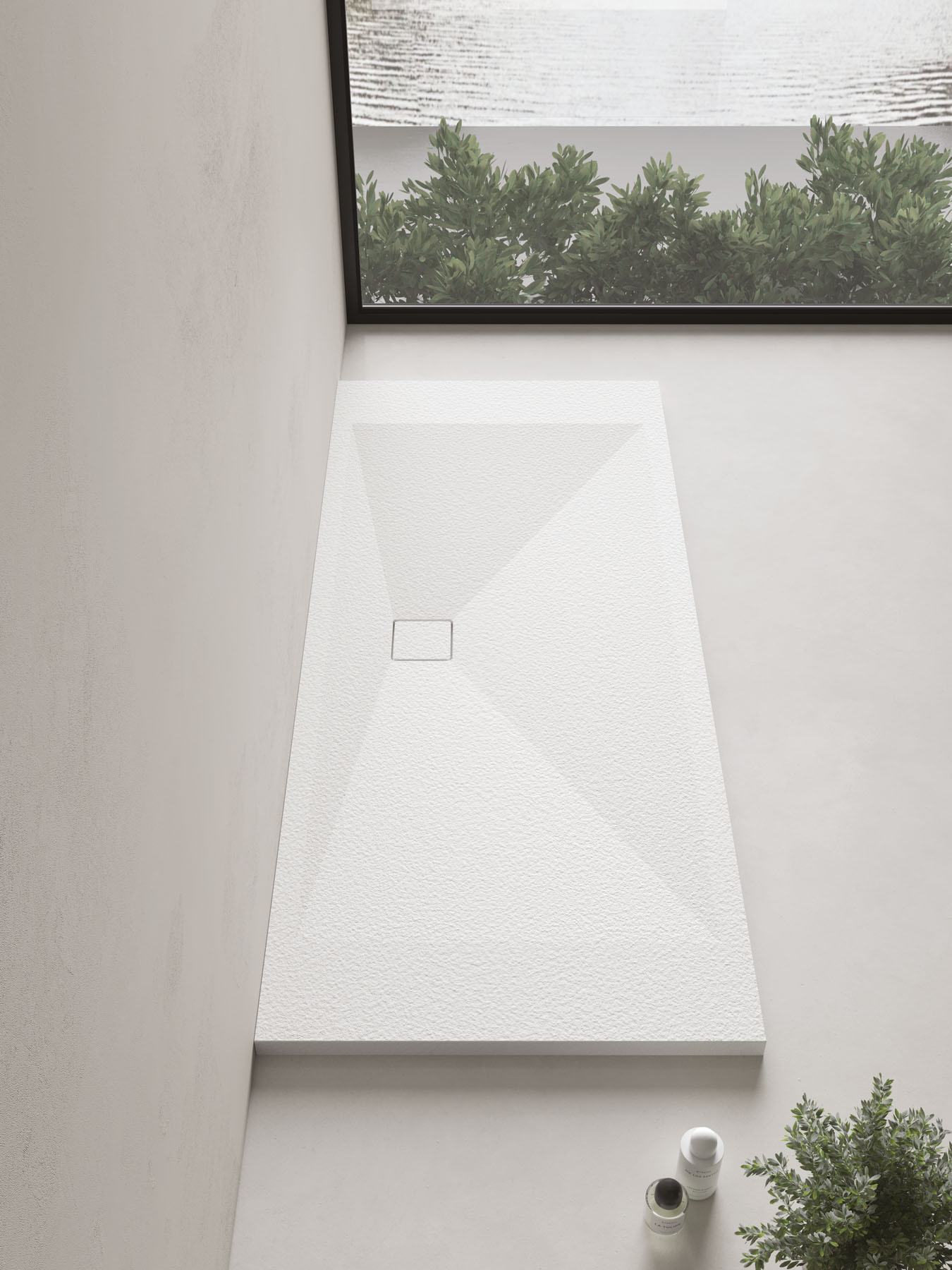 Die spezielle Textur der Duschwanne Join passt sich unterschiedlichsten Planungsanforderungen an. Sie ist bodengleich oder erhöht in zahlreichen Ausführungen erhältlich. Dieses Modell kann maßgefertigt werden. Der farblich passende Ablauf befindet sich an der Breitseite der Duschwanne.