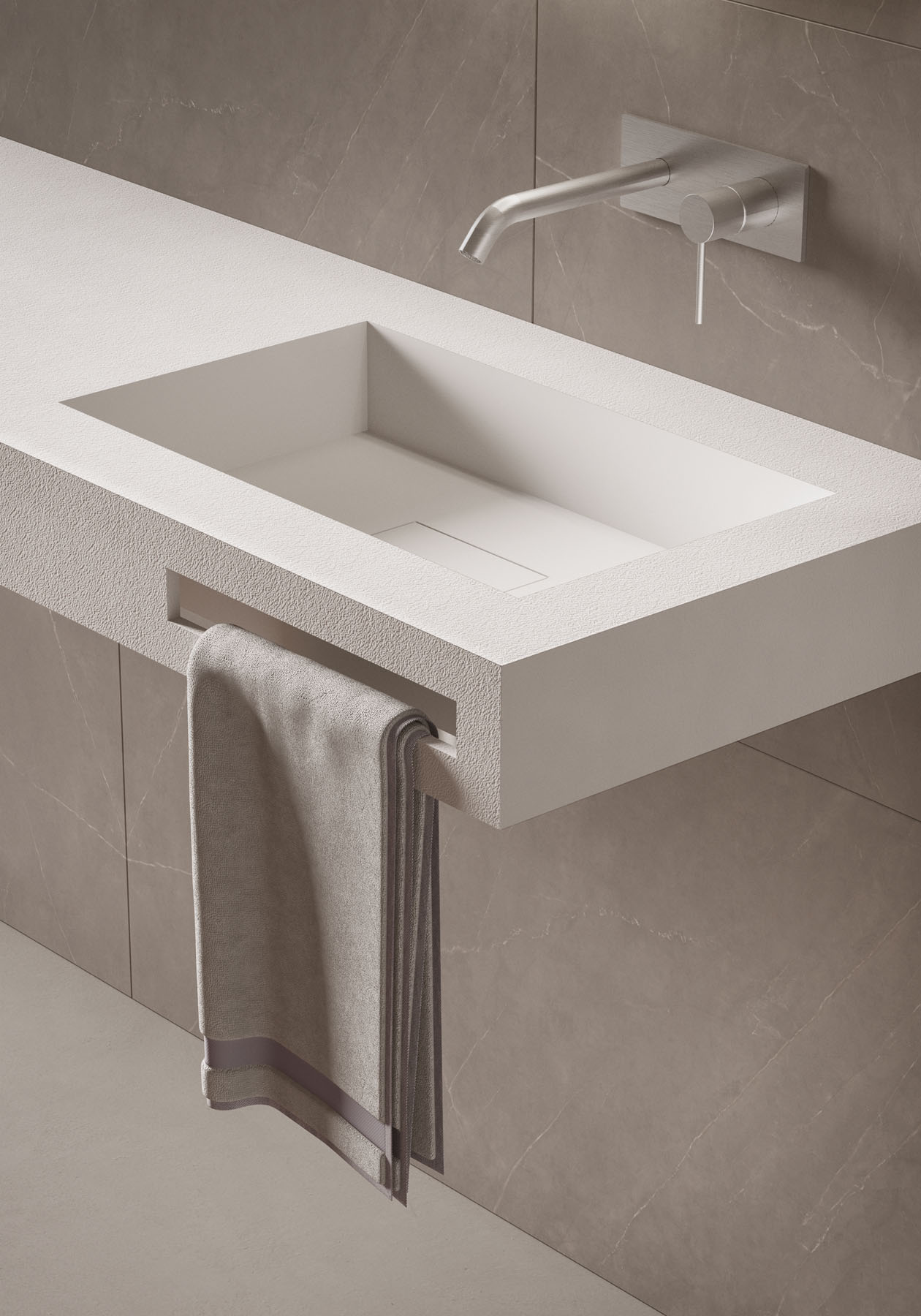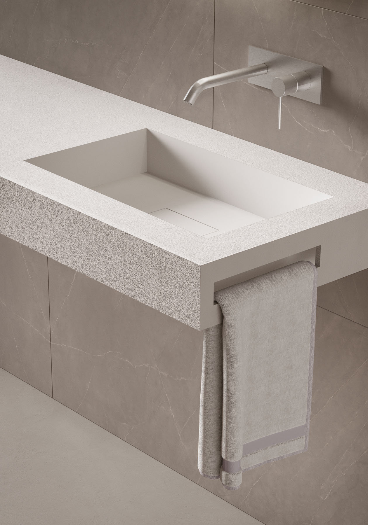 Sie kann mit der Hohlkern-Waschtischplatte mit integriertem Waschbecken und mit dem Designheizkörper Helios in der gleichen Ausführung und Textur kombiniert werden.