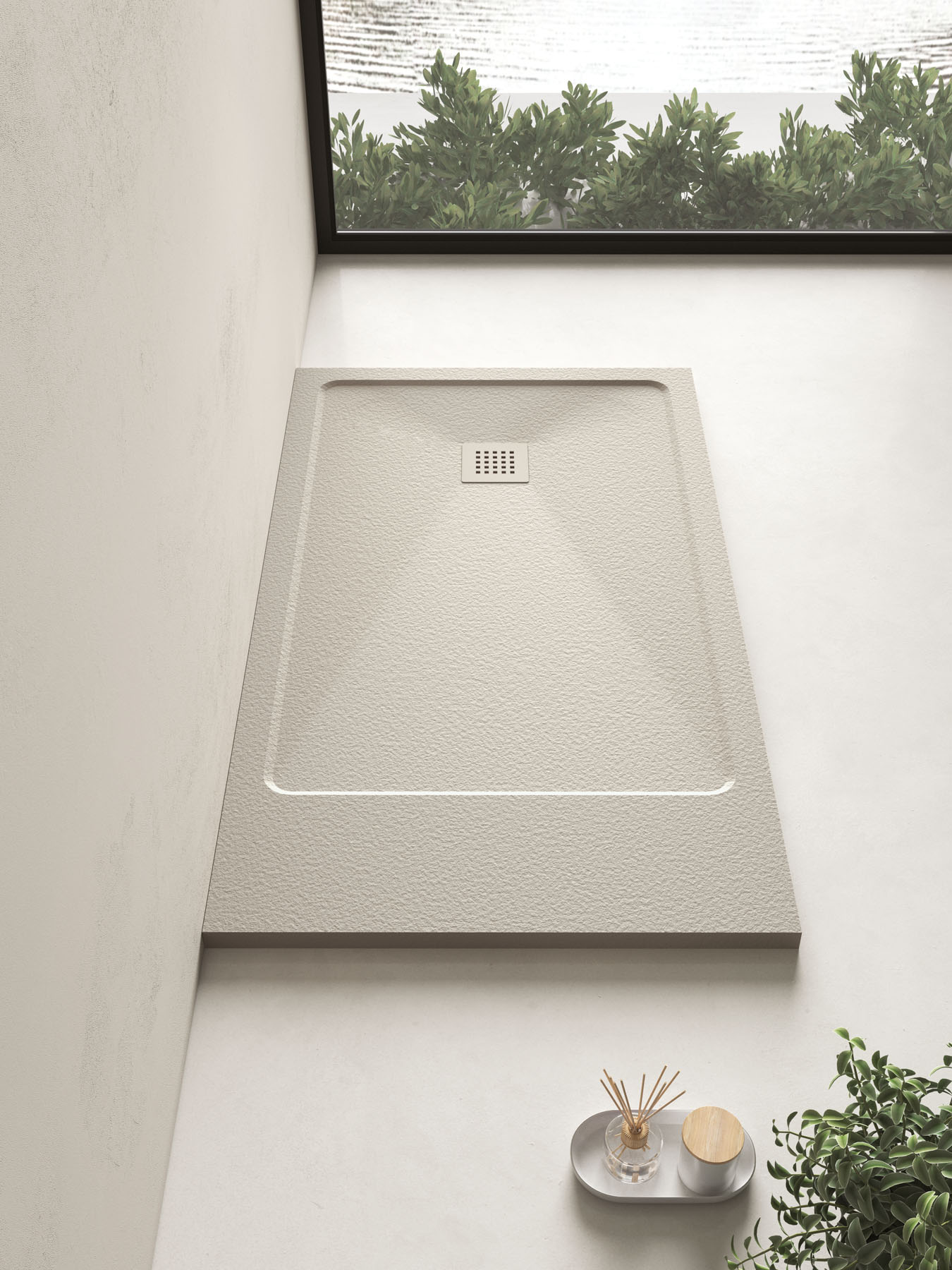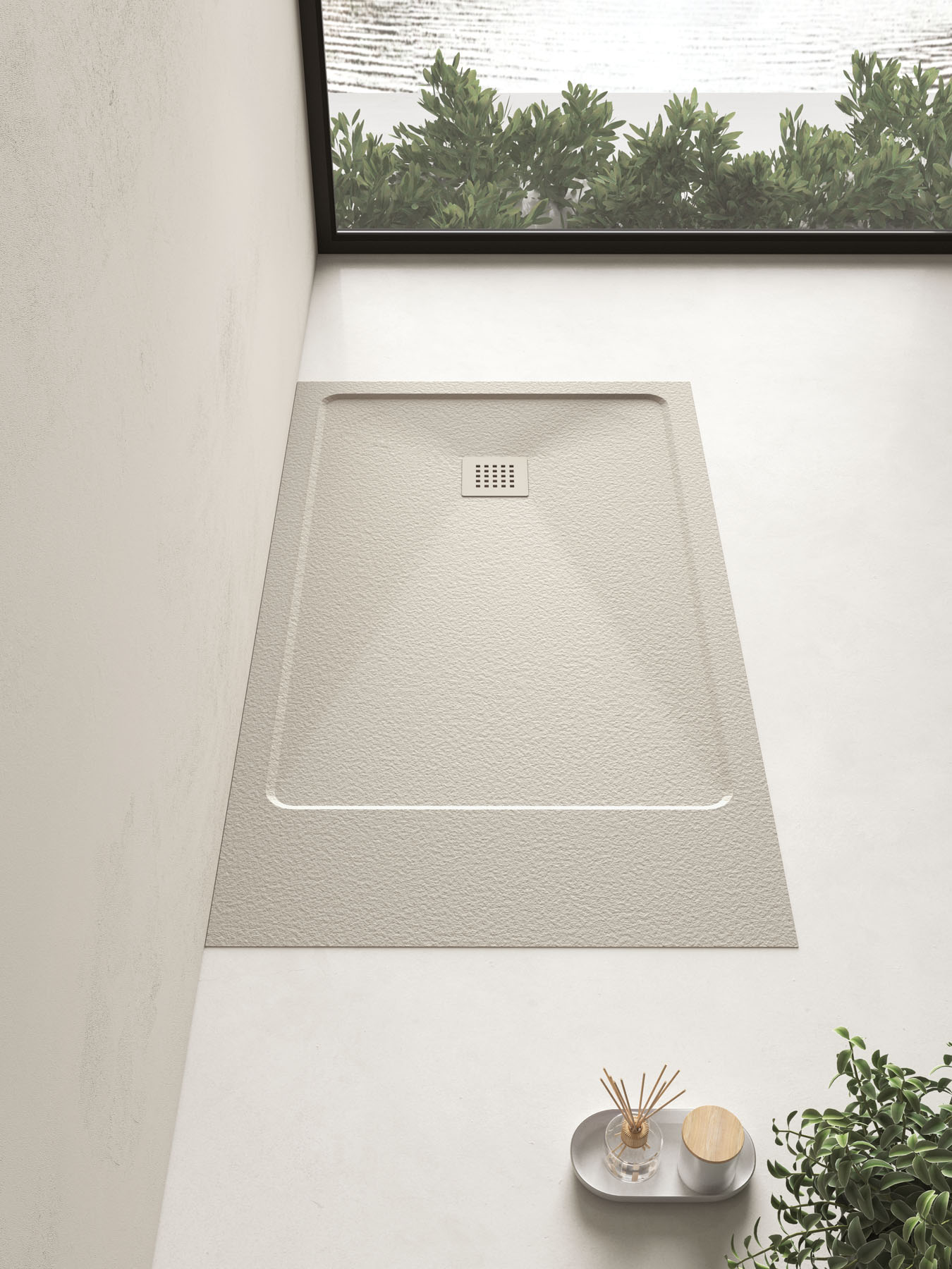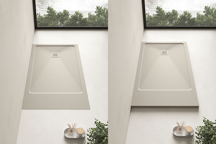 Diese Duschwanne mit optisch attraktiver Relieftextur und außermittigem Ablauf verleiht der Duschkabine ein individuelles Design. Bei diesem Modell ist sowohl die Duschwanne mit durchgehender Neigung als auch die Version FM maßgefertigt erhältlich.