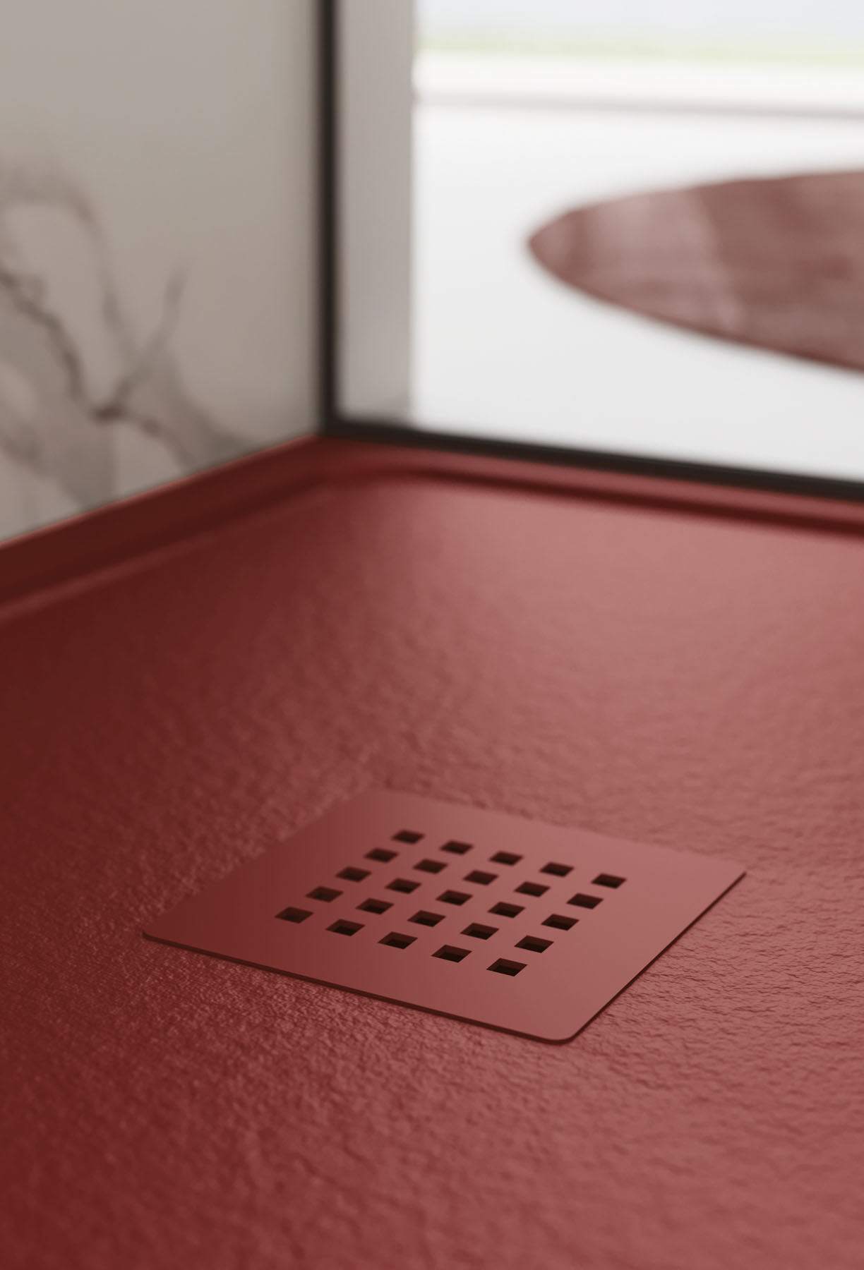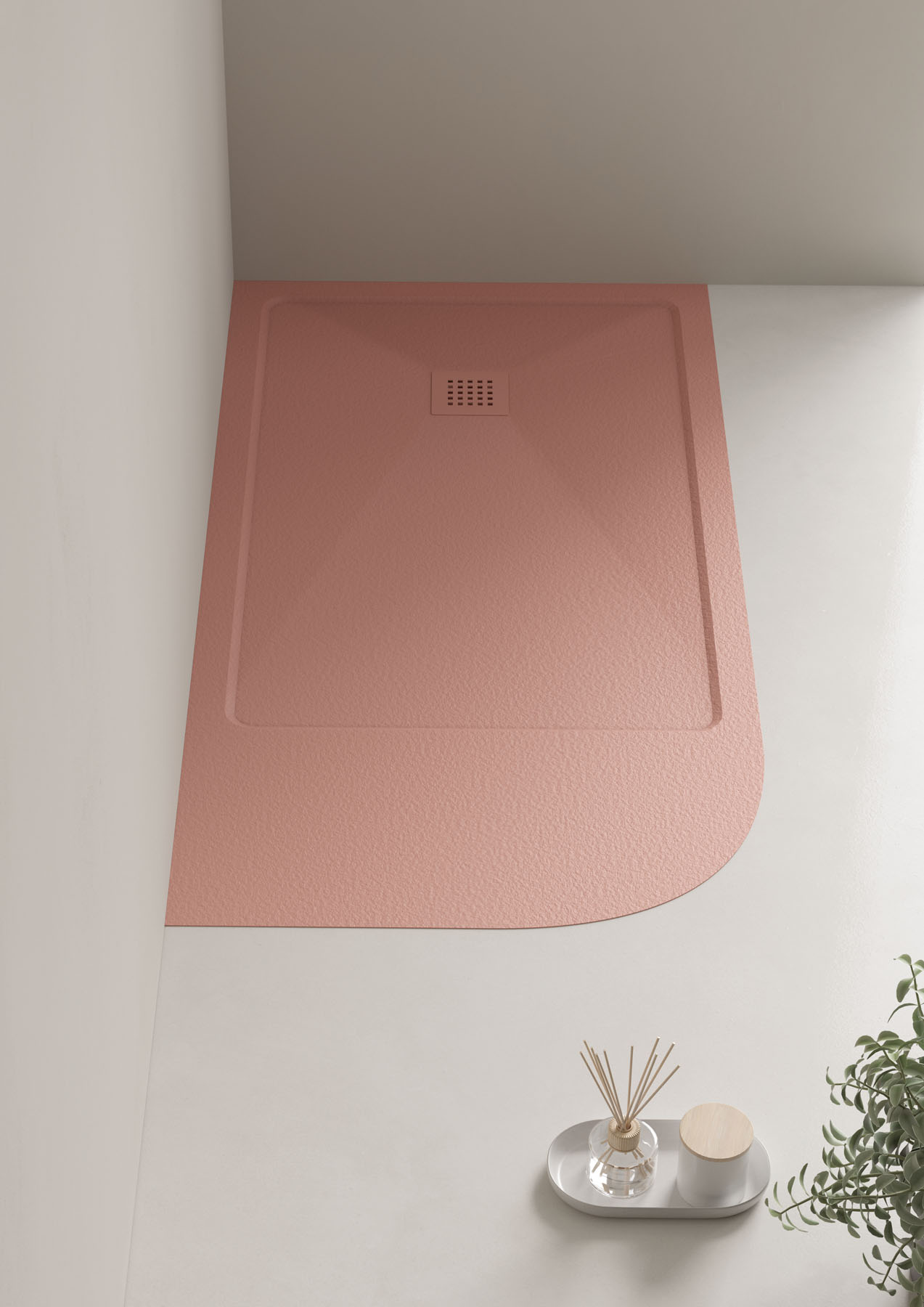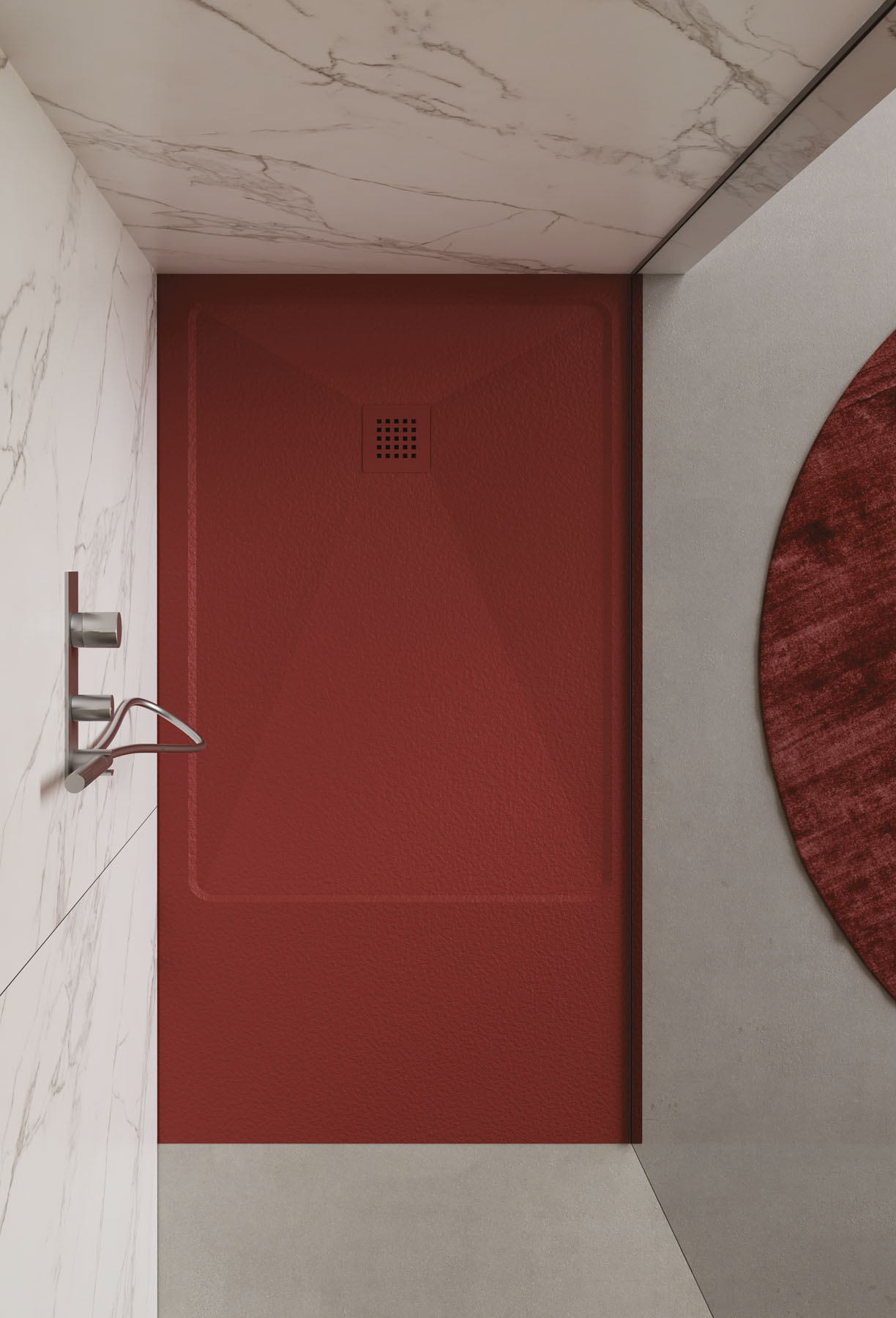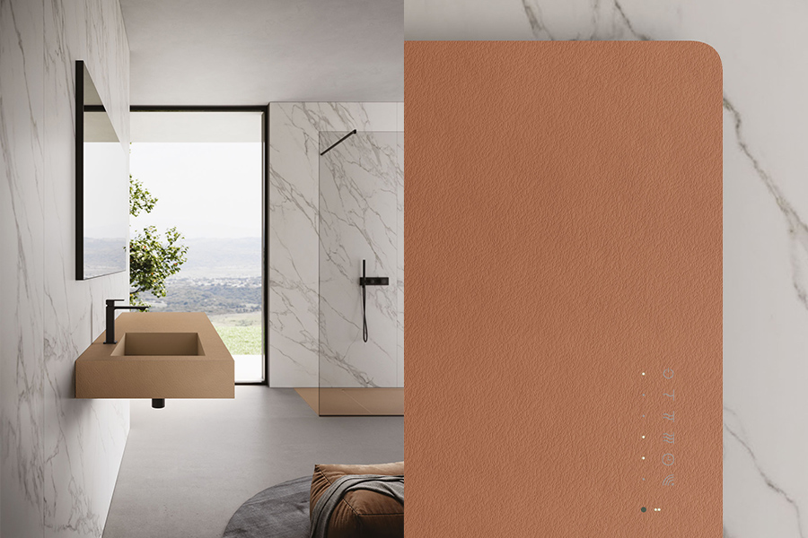 Die Textur und die Farben der Duschwanne Luna können auf die Hohlkern-Waschtischplatte mit integriertem Waschbecken und den Designheizkörper Helios abgestimmt werden.