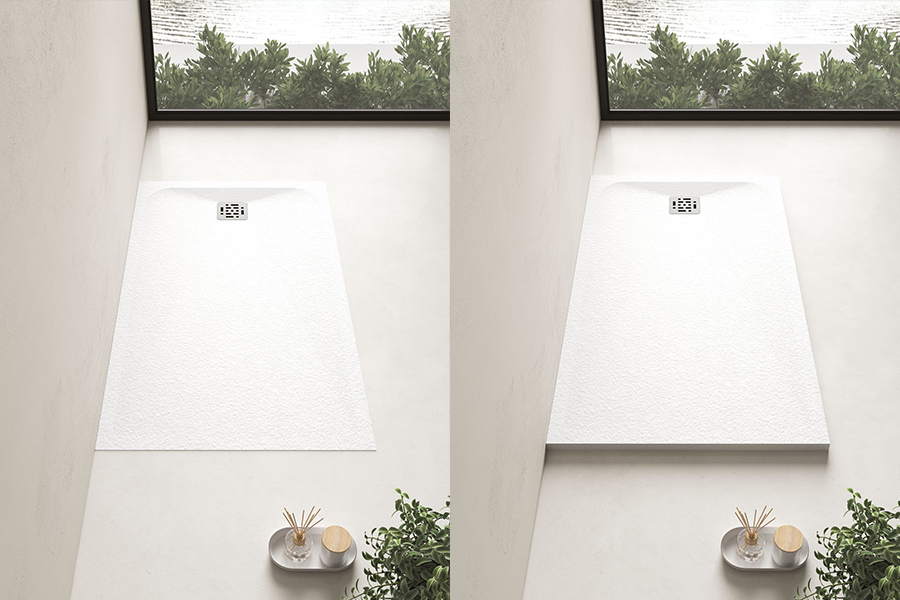 Eine in verschiedenen Ausführungen erhältliche Design-Duschwanne ist die richtige Wahl für eine angesagte Duschkabine. Bei diesem Modell ist sowohl die Duschwanne mit durchgehender Neigung als auch die Version FM maßgefertigt erhältlich.
