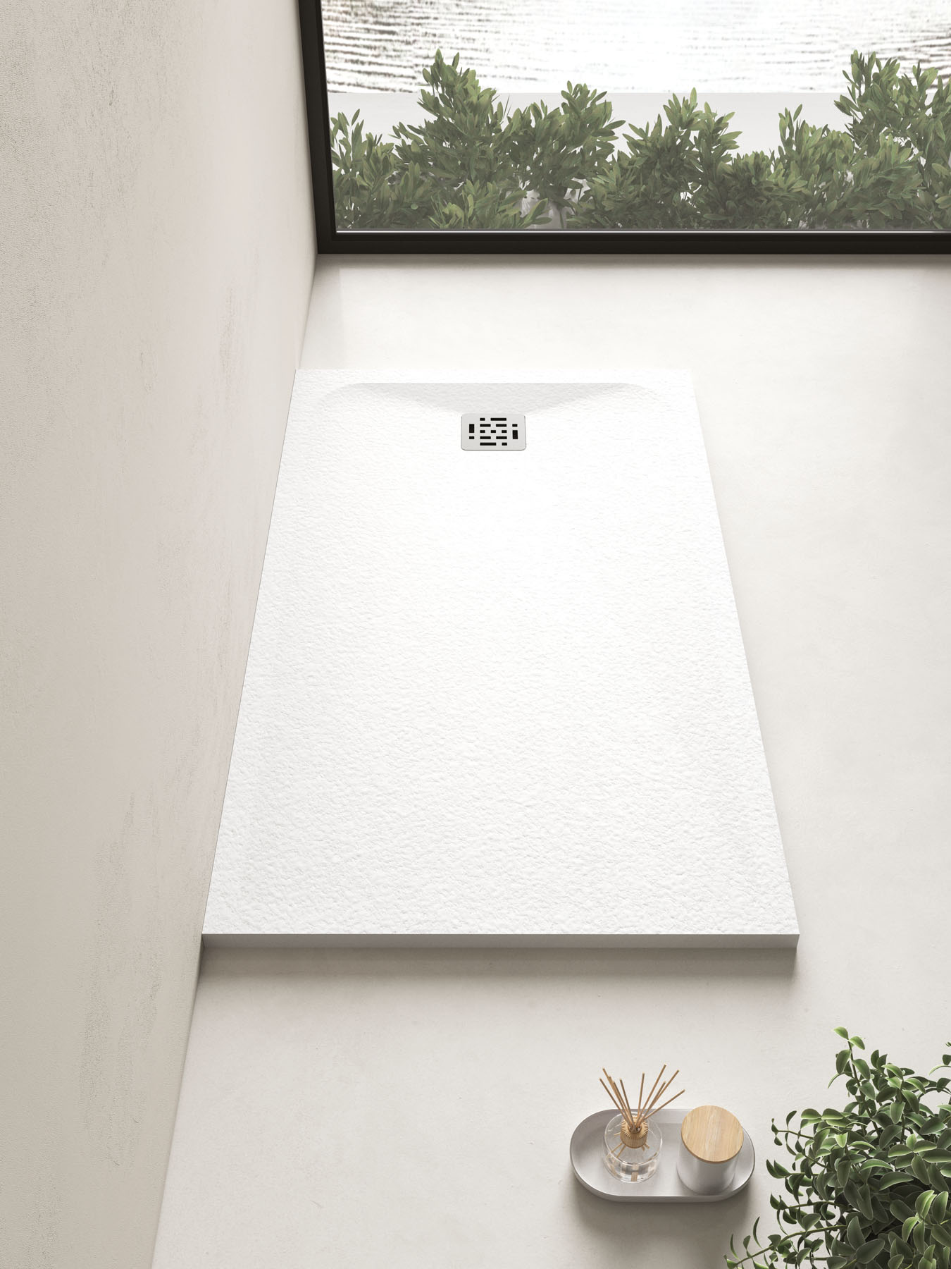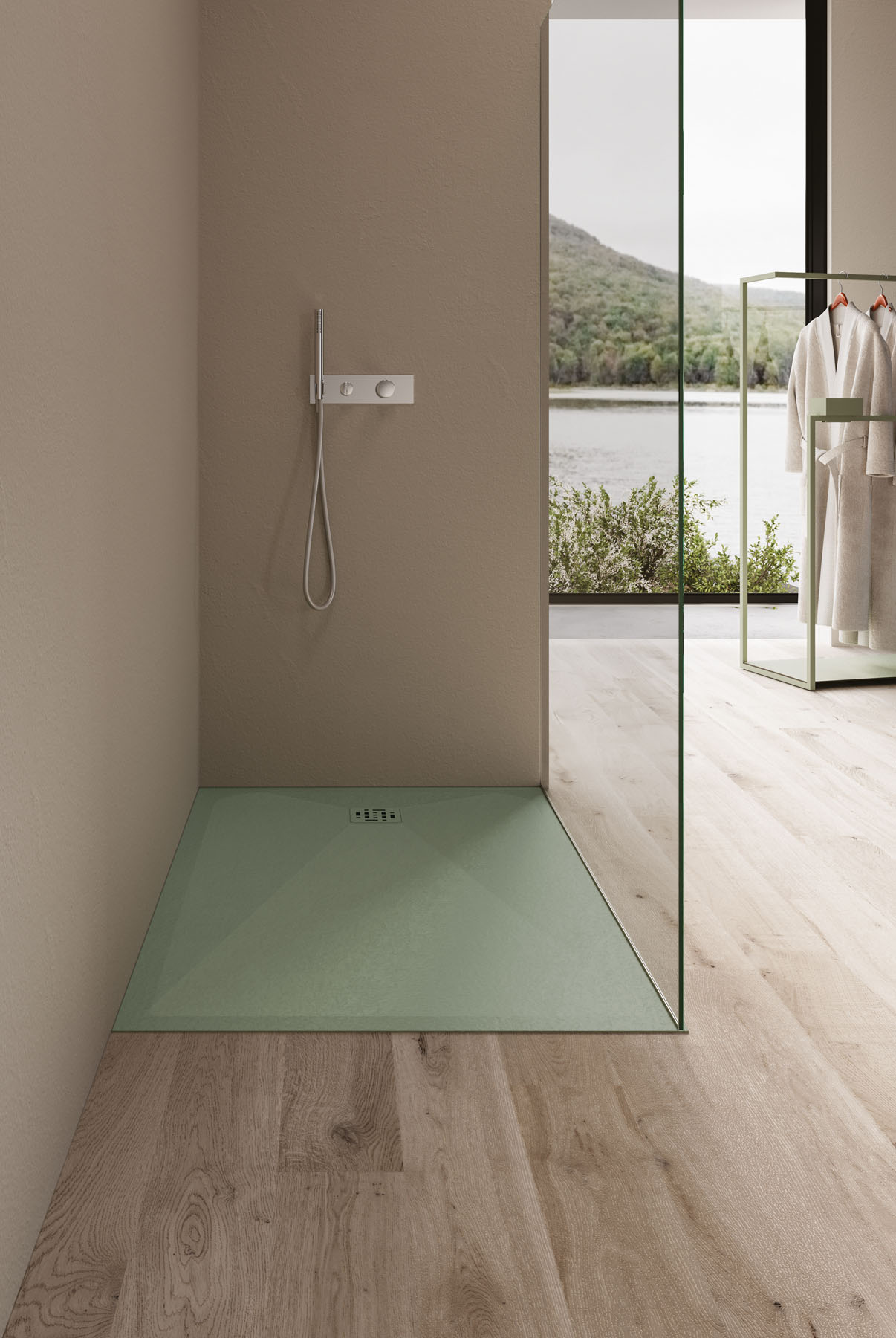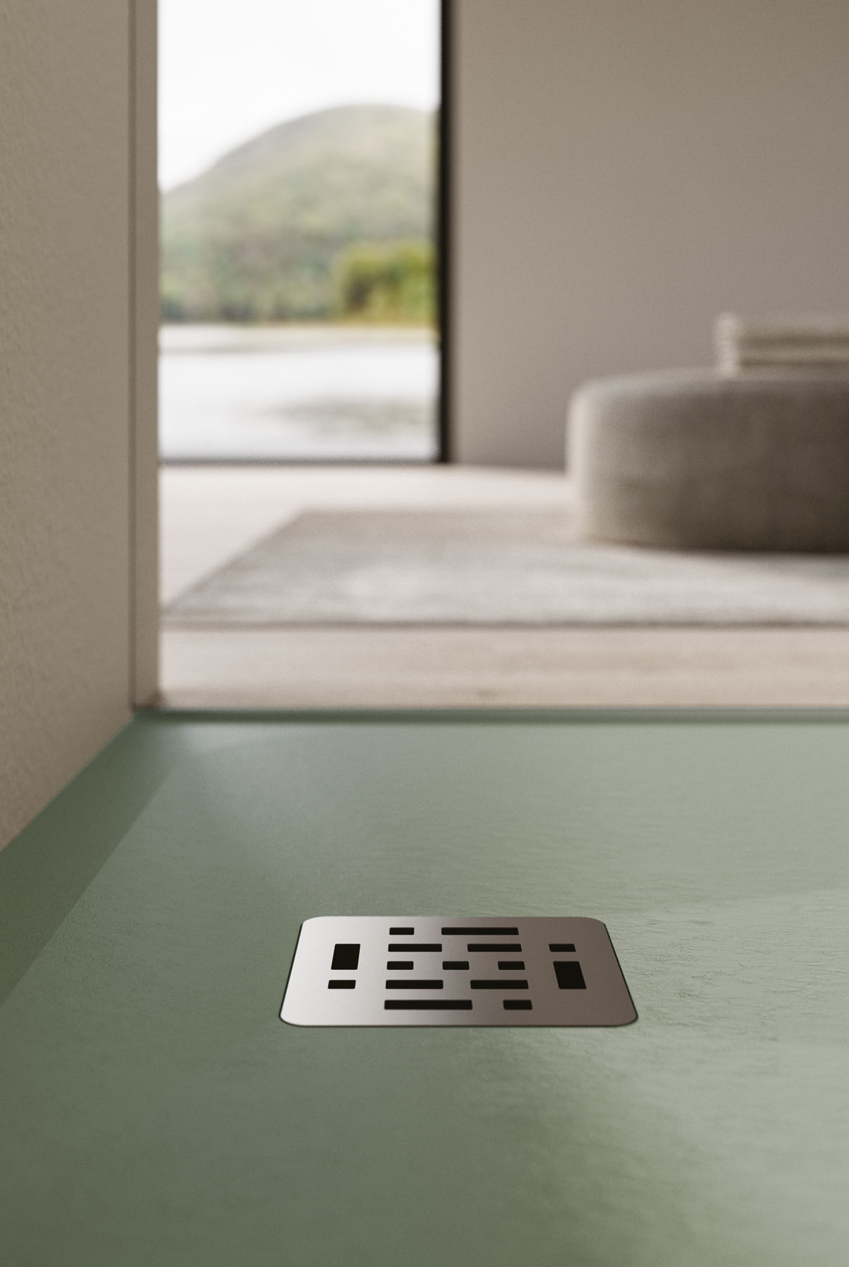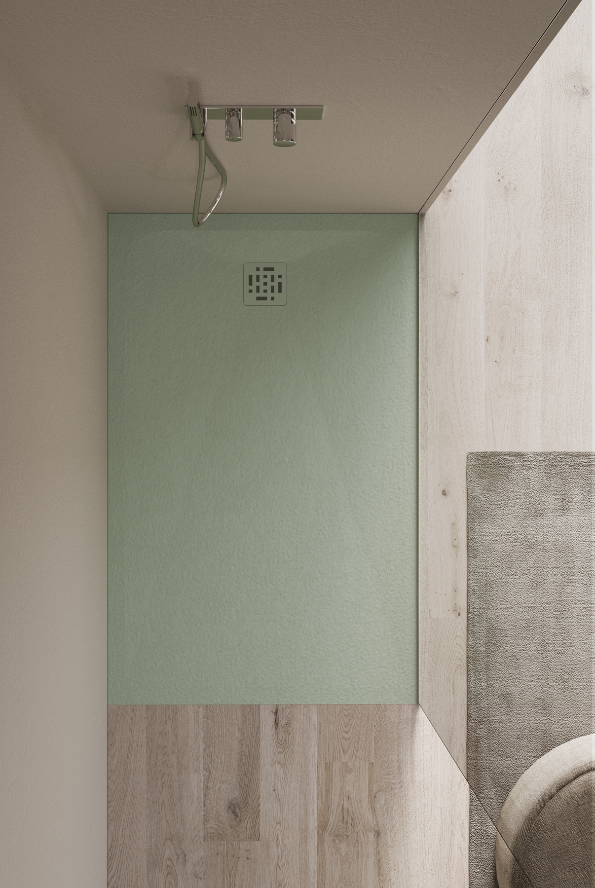 Die Textur und die Farben der Duschwanne Piano können auf die Hohlkern-Waschtischplatte mit integriertem Waschbecken und den Designheizkörper Helios abgestimmt werden.
