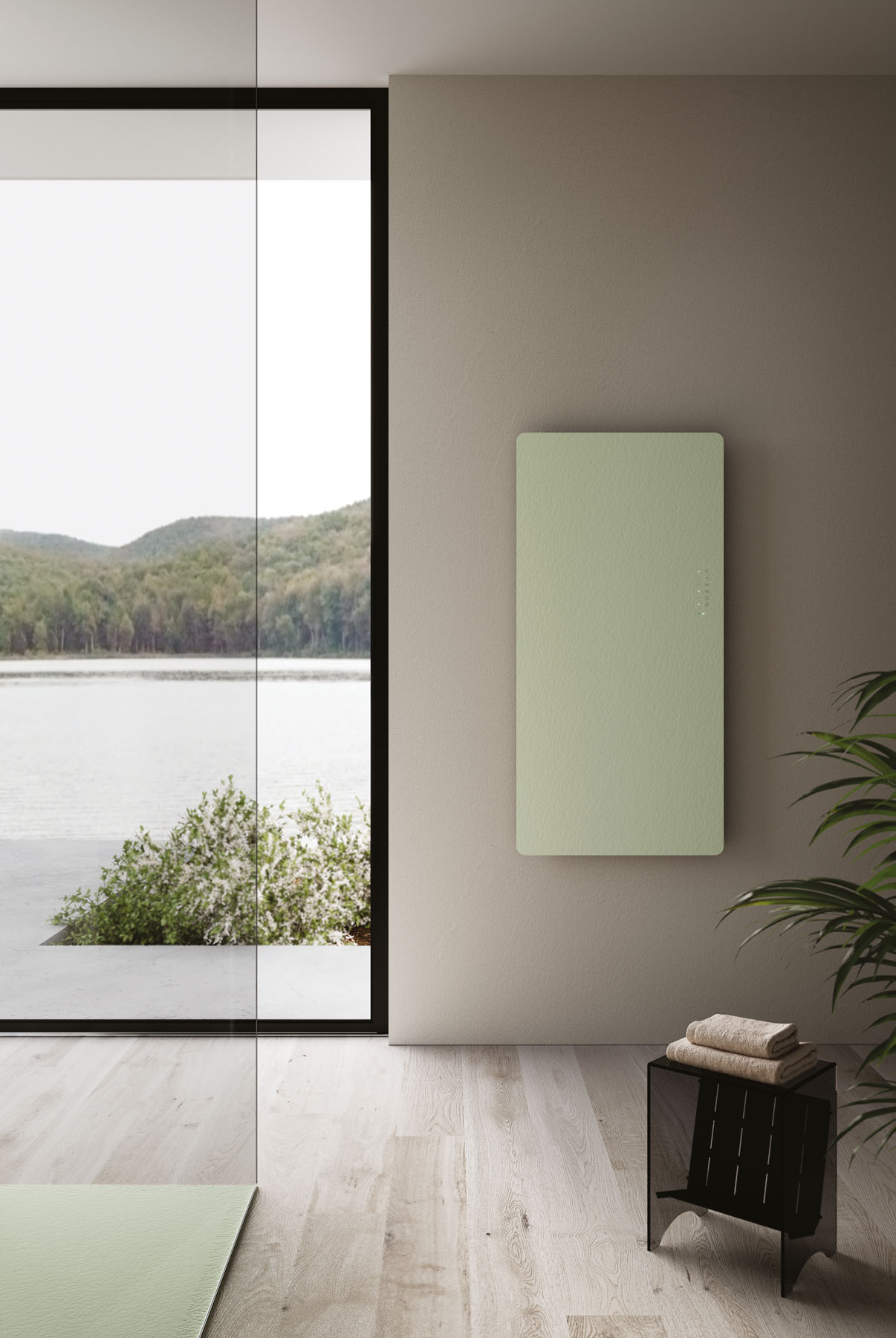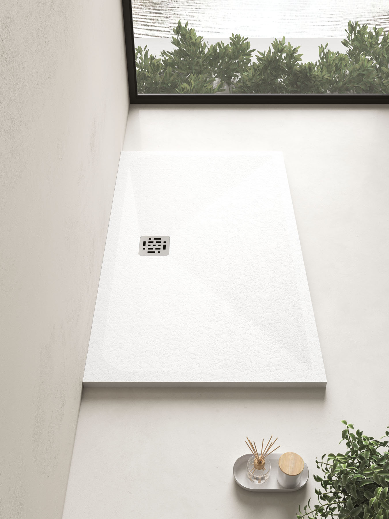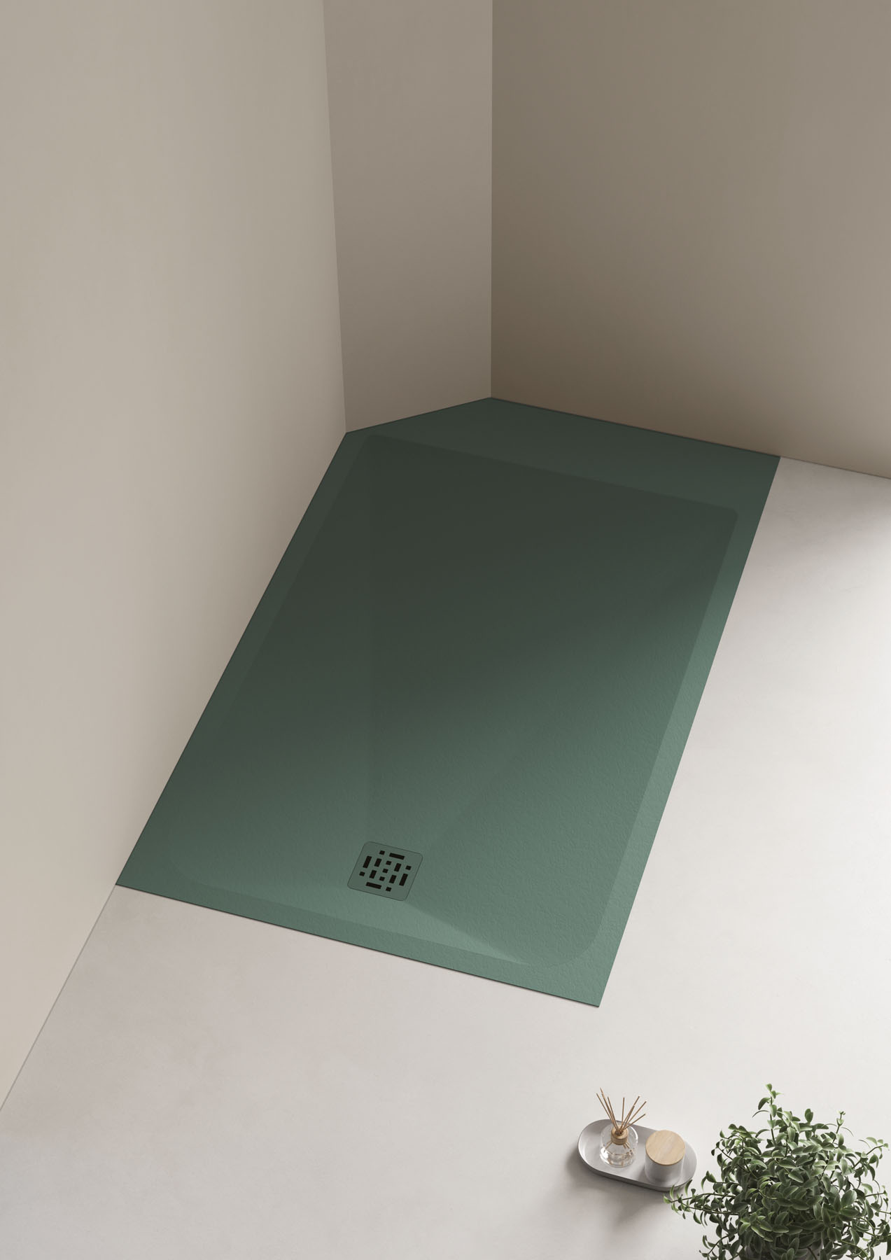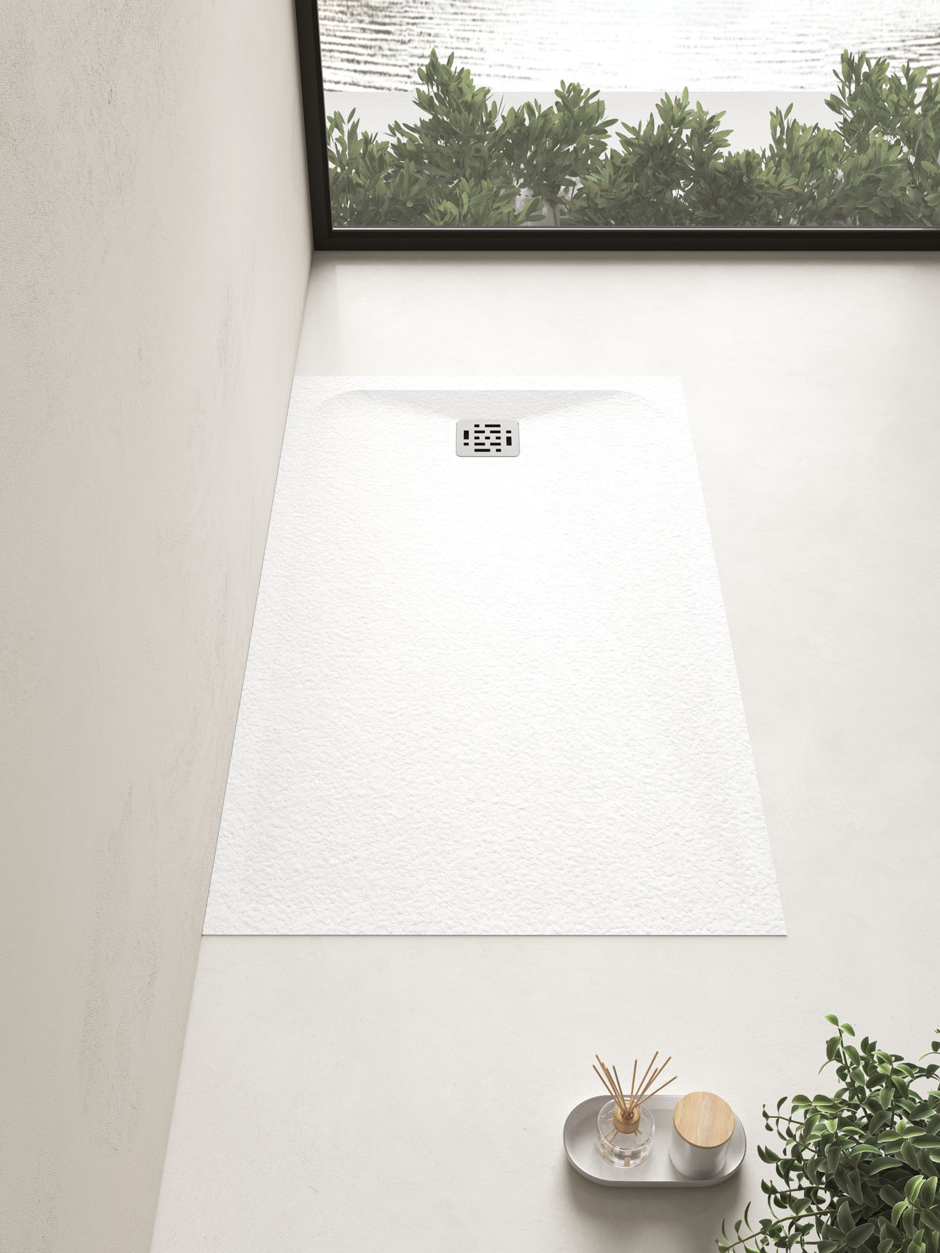 Die Textur und die Farben der Duschwanne Piano können auf die Hohlkern-Waschtischplatte mit integriertem Waschbecken und den Designheizkörper Helios abgestimmt werden.