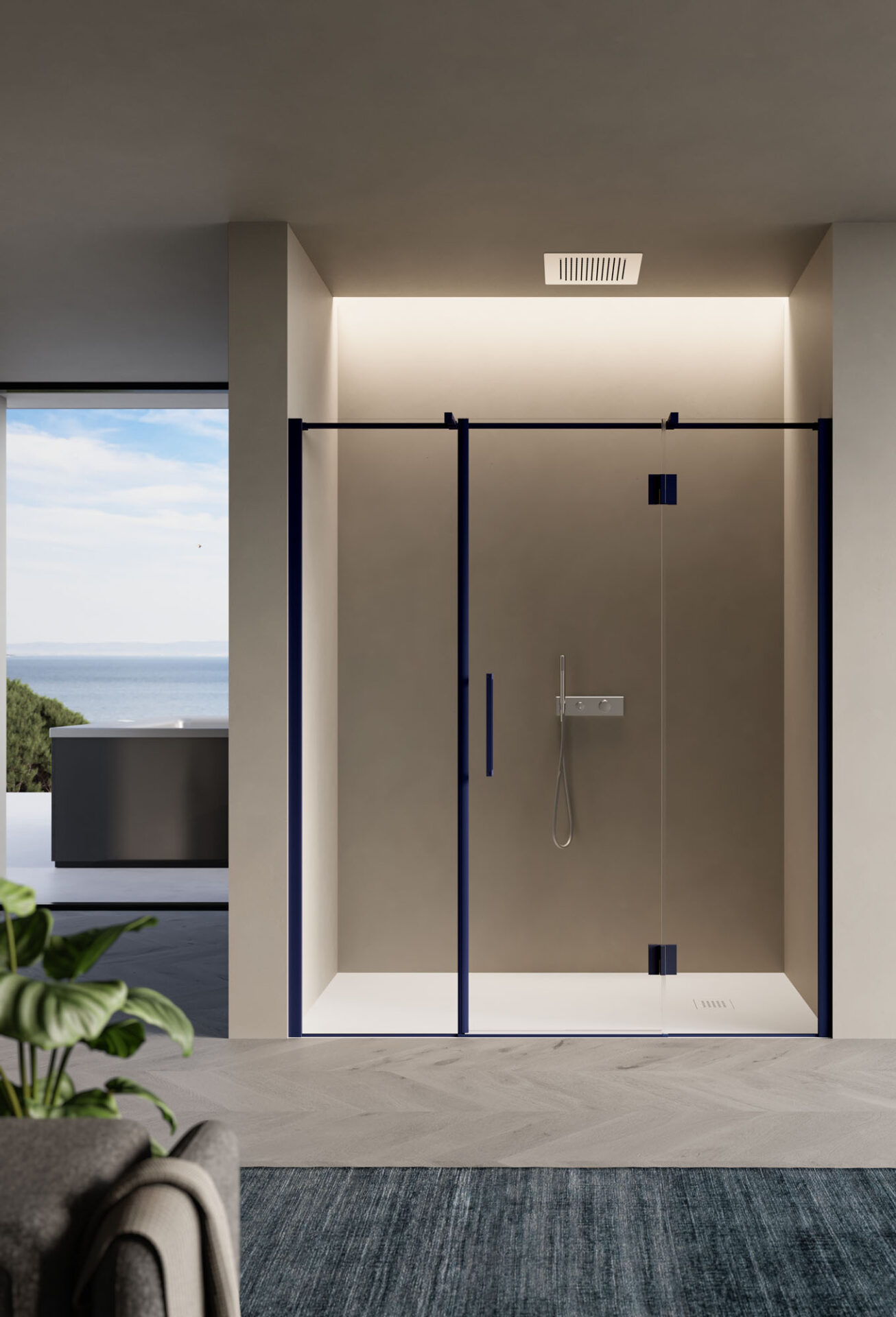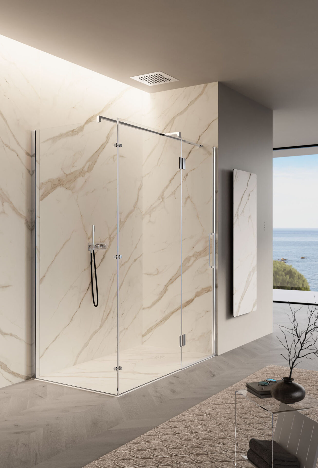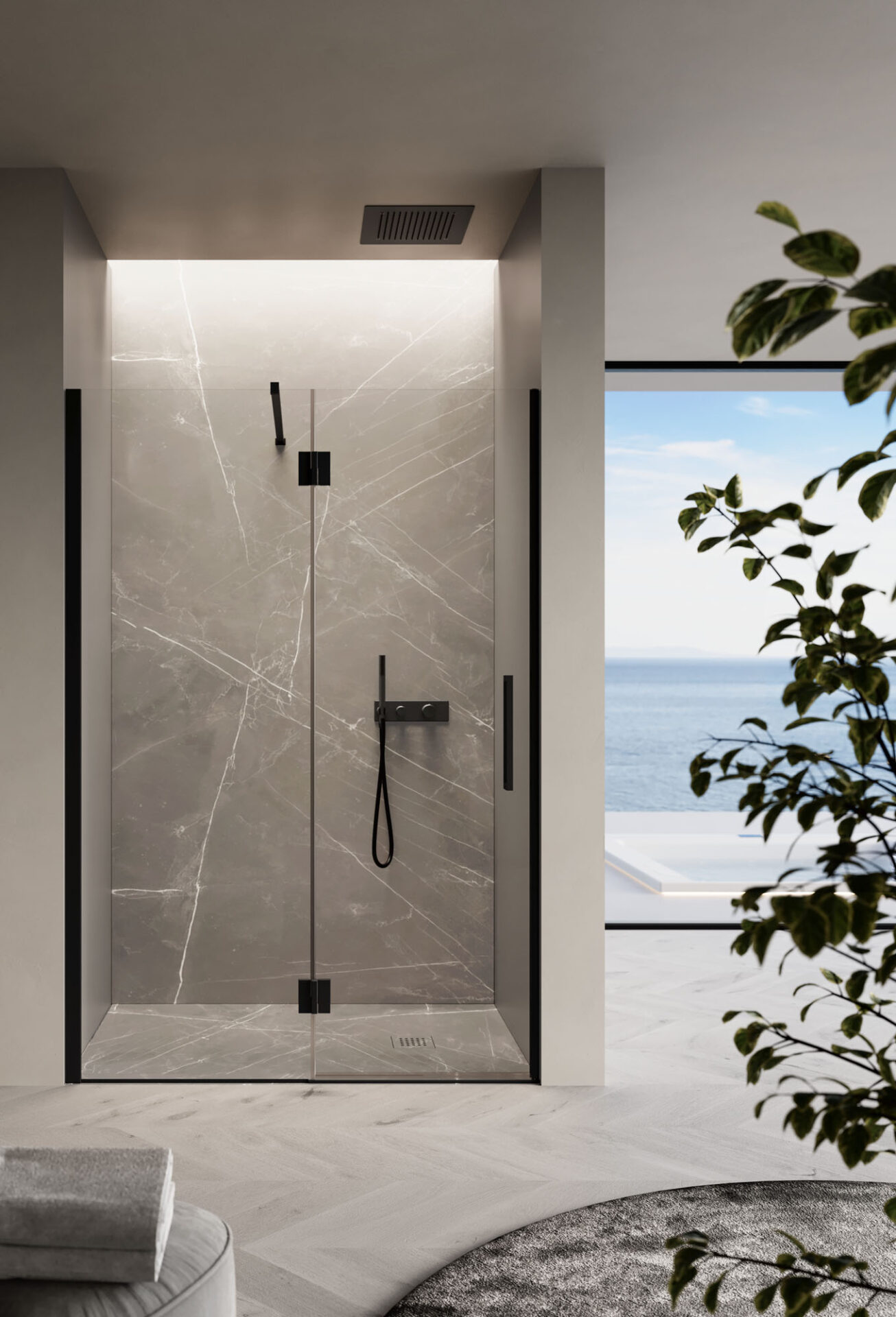 Easy ist eine rahmenlose Duschkabine mit Drehtür in schlichtem Design, die in der Nische, in der Ecke, an der Wand und halbgemauert erhältlich ist. Die Scharniere sind auf der Innenseite vollständig mit dem Glas bündig so dass die Tür um 180° geöffnet werden kann. Der Griff ist beidseitig.