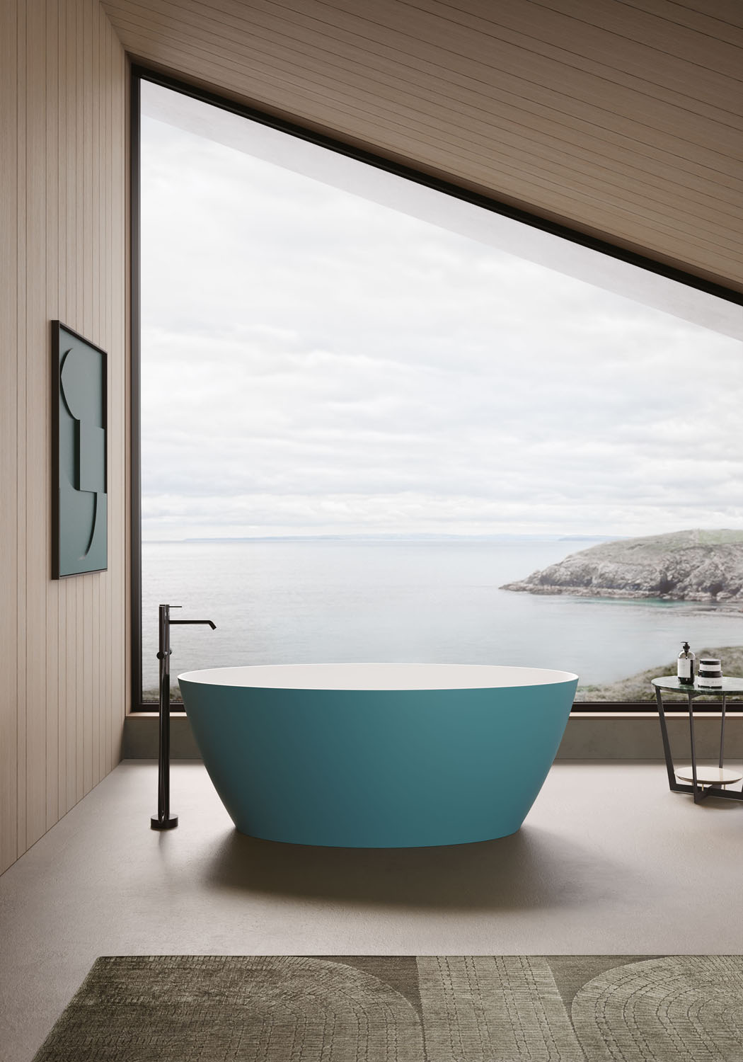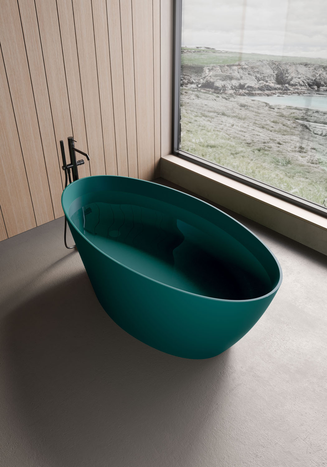 Die Form der freistehenden Badewanne Lake ist der Natur nachempfunden. Durch ihre Höhe (60 cm) dominiert sie das Bad, wodurch sie sich perfekt für Wohnbäder eignet, die beispielsweise in das Schlafzimmer übergehen. Sie ist in zwei Ausführungen erhältlich: aus strong>M-Solid in Bianco matt, das außen oder auch innen in allen matten Lackfarben von Ideagroup oder RAL-/NCS-Farben lackiert werden kann (ohne Überlauf, mit Druckknopf-Ablaufventil erhältlich, mit farblich passendem Ablaufdeckel), und aus M-Lux in Bianco hochglanz (mit Ablaufdeckel in Bianco hochglanz).