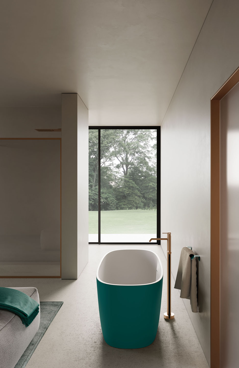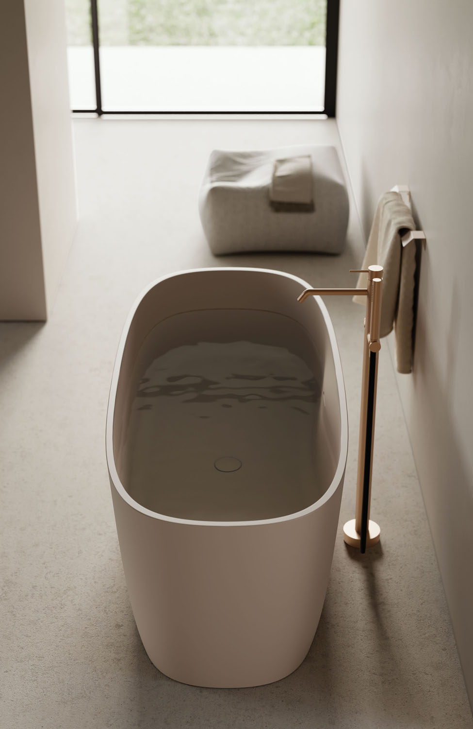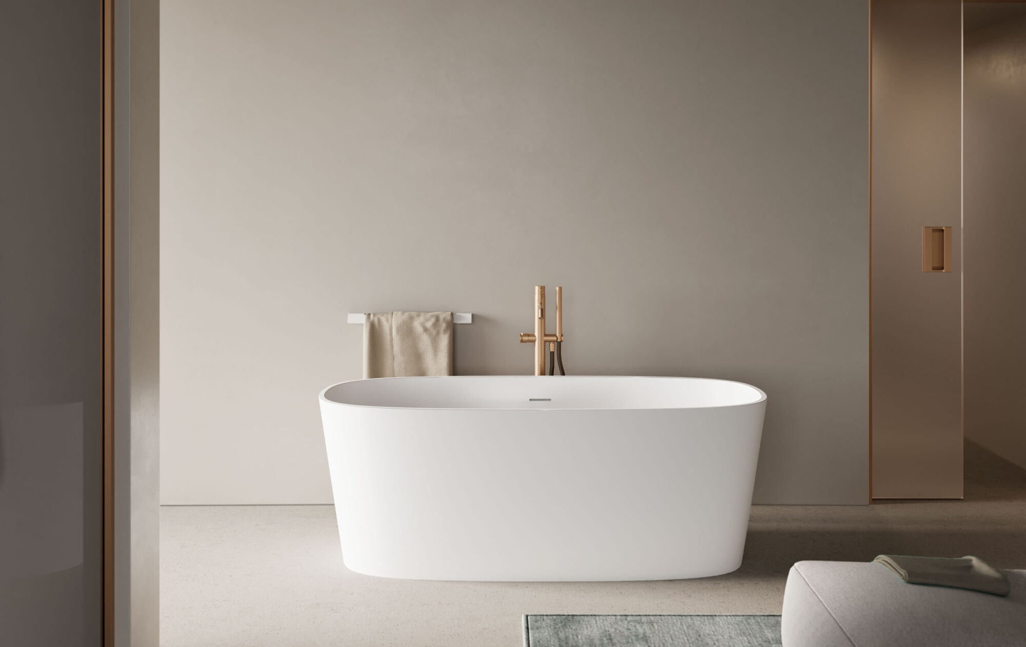 Die freistehende Design-Badewanne Loop bietet täglichen Komfort. Sie ist aus Cristalplant® in Bianco matt erhältlich und kann außen oder auch innen in allen matten Lackfarben von Ideagroup oder RAL-/NCS-Farben lackiert werden. Überlauf in die Badewanne integriert. Mit Druckknopf-Ablaufventil erhältlich. Mit farblich passendem Ablaufdeckel.