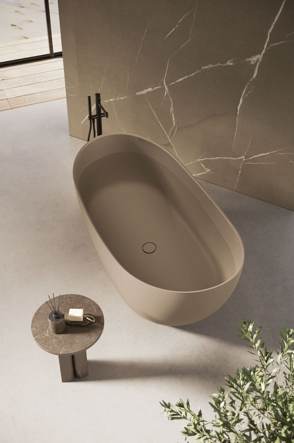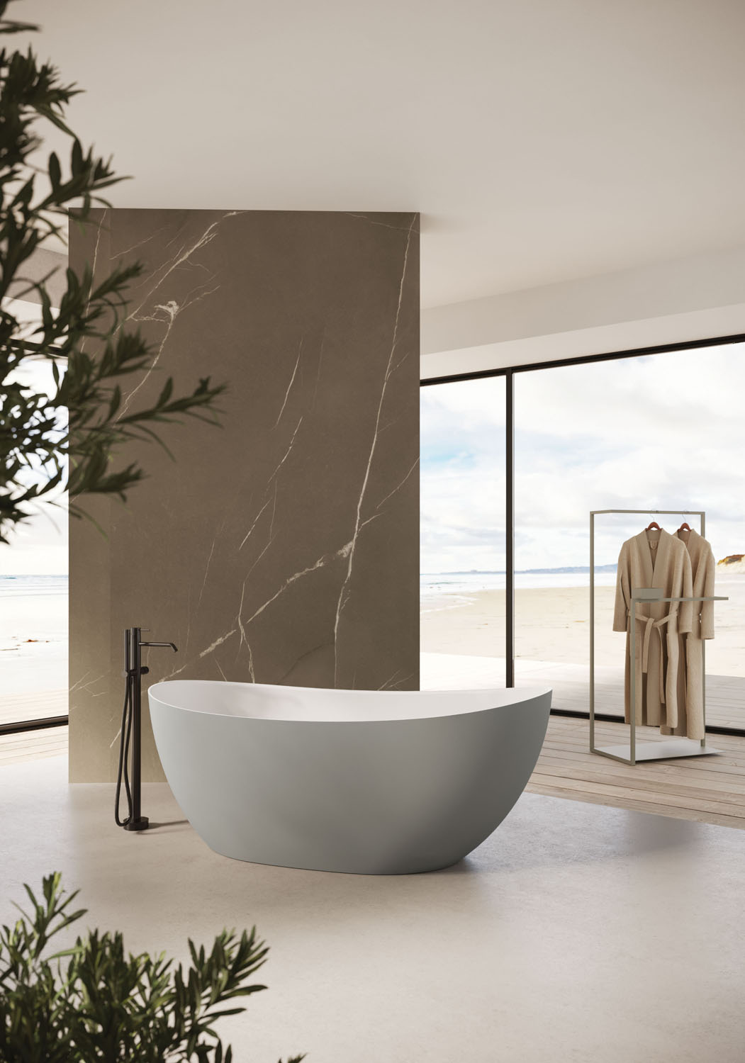Seven ist eine freistehende Badewanne mit schmeichelnden Formen, die in zwei Ausführungen erhältlich ist: aus M-Solid in Bianco matt, das außen oder auch innen in allen matten Lackfarben von Ideagroup oder RAL-/NCS-Farben lackiert werden kann (mit farblich passendem Ablaufdeckel), und aus M-Lux in Bianco hochglanz (mit Ablaufdeckel in Bianco hochglanz). Ohne Überlauf. Mit Druckknopf-Ablaufventil erhältlich.