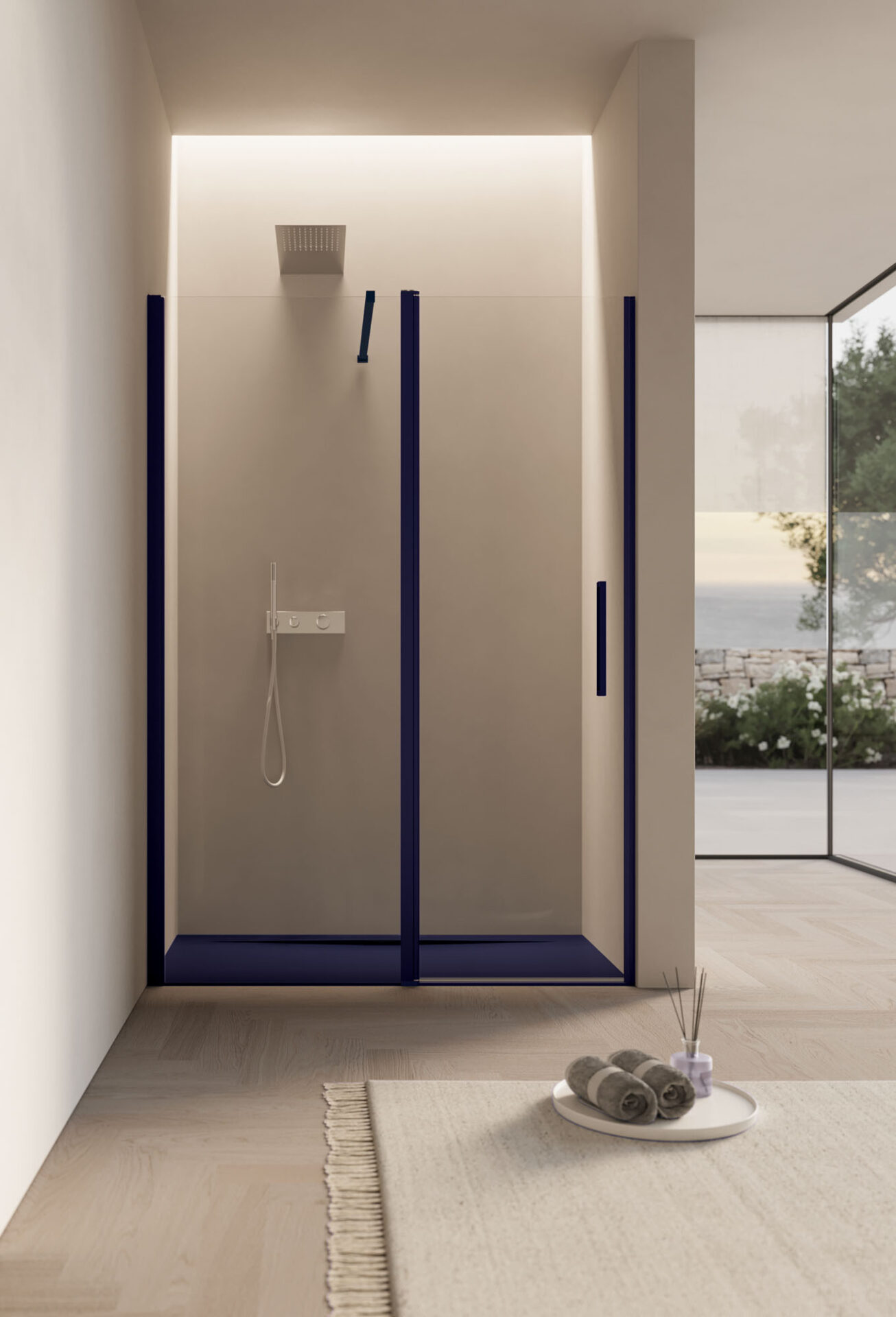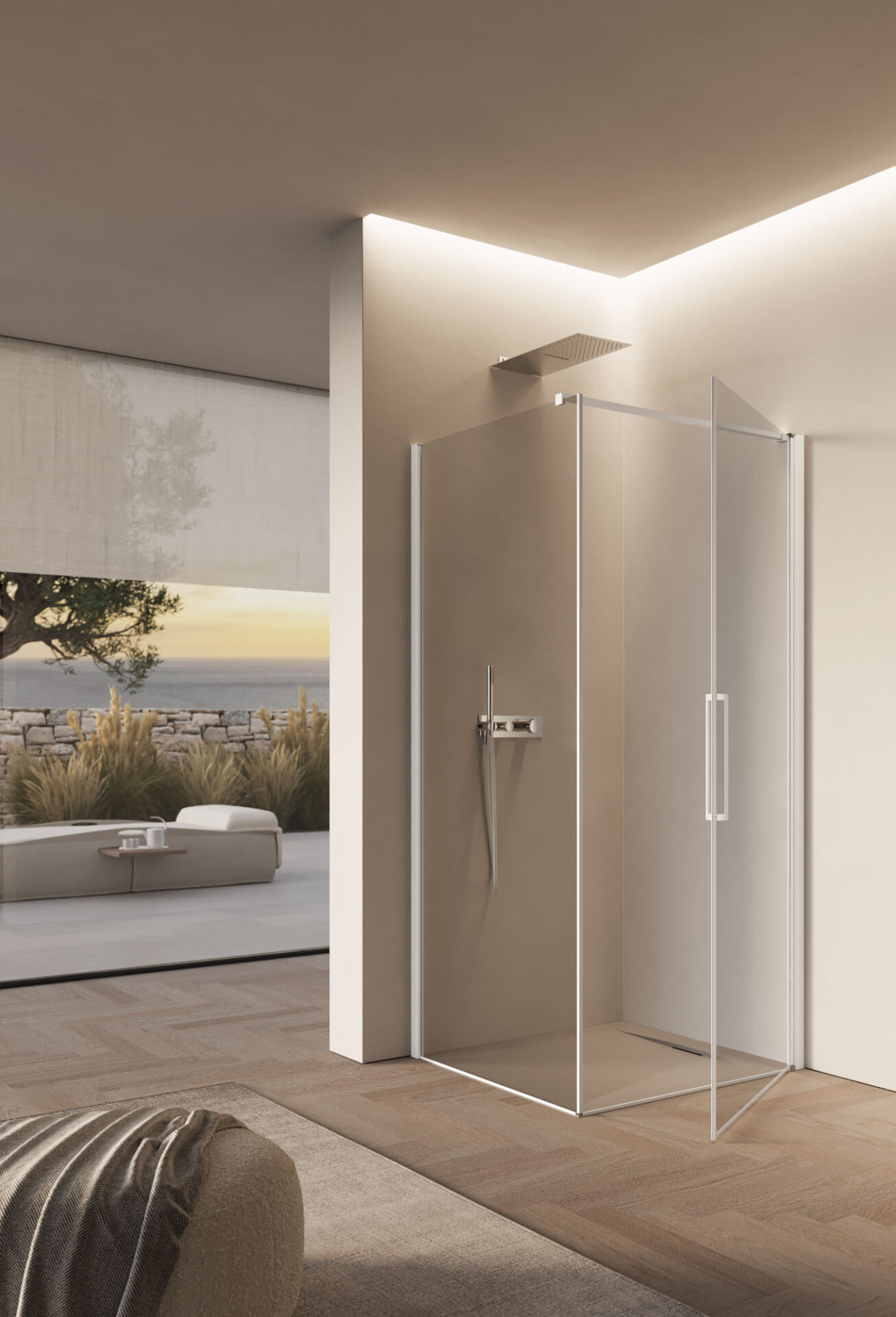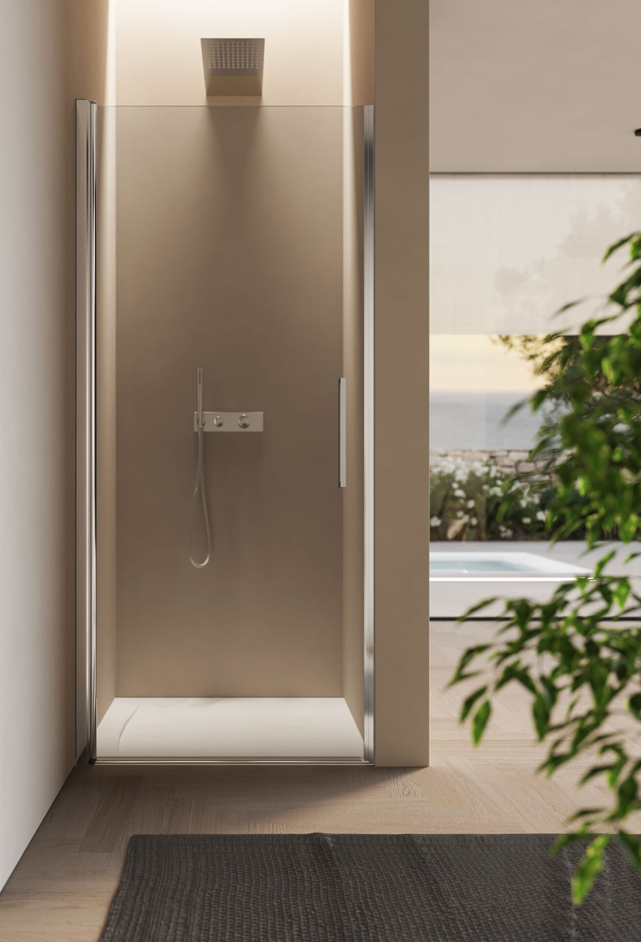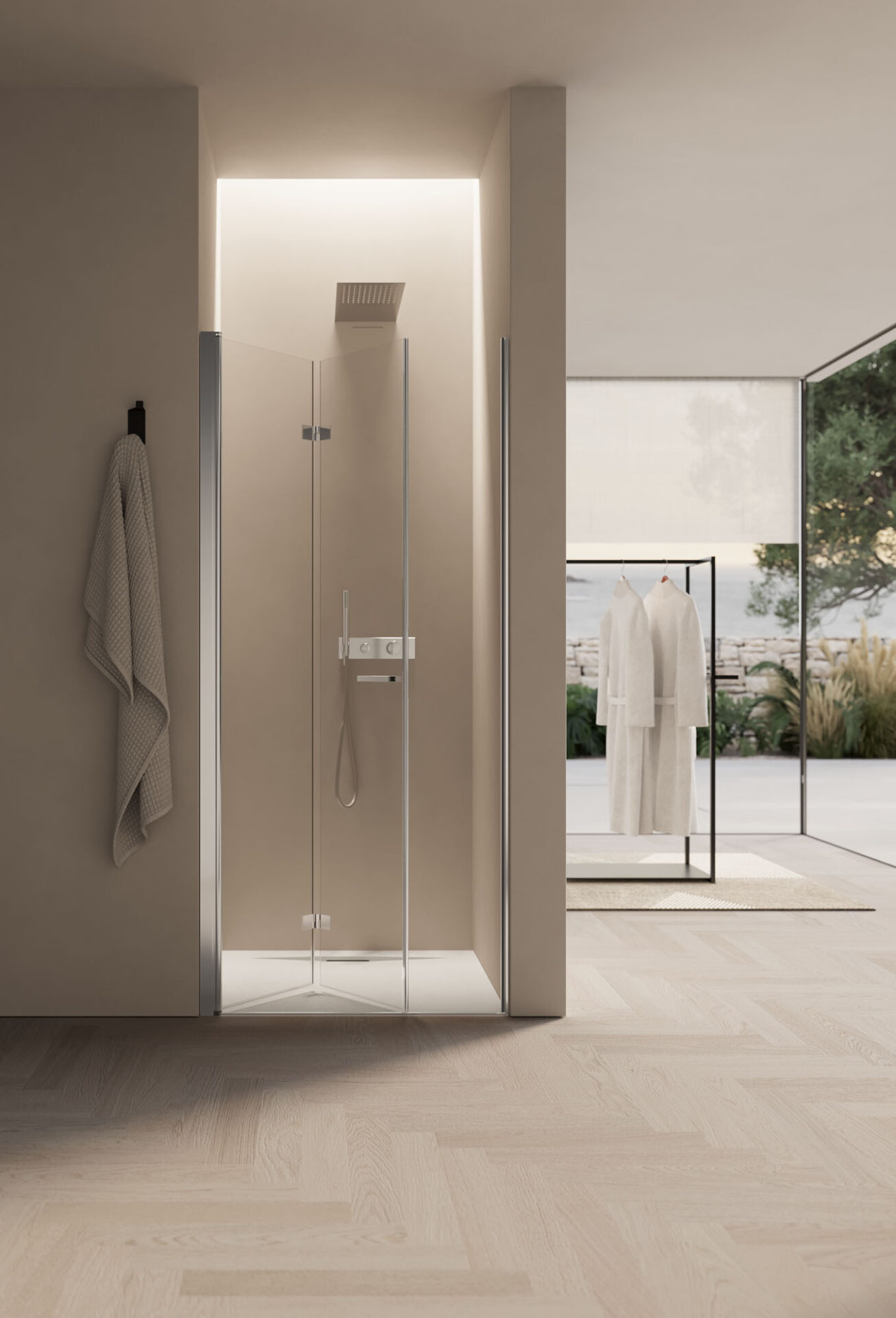 Die Duschkabine Omega mit Drehtür, Doppeldrehtür, Falttür oder Saloontür zeichnet sich durch ihre puristische Optik aus und ist in der Nische, in der Ecke, halbgemauert oder als Badewannenaufsatz erhältlich.