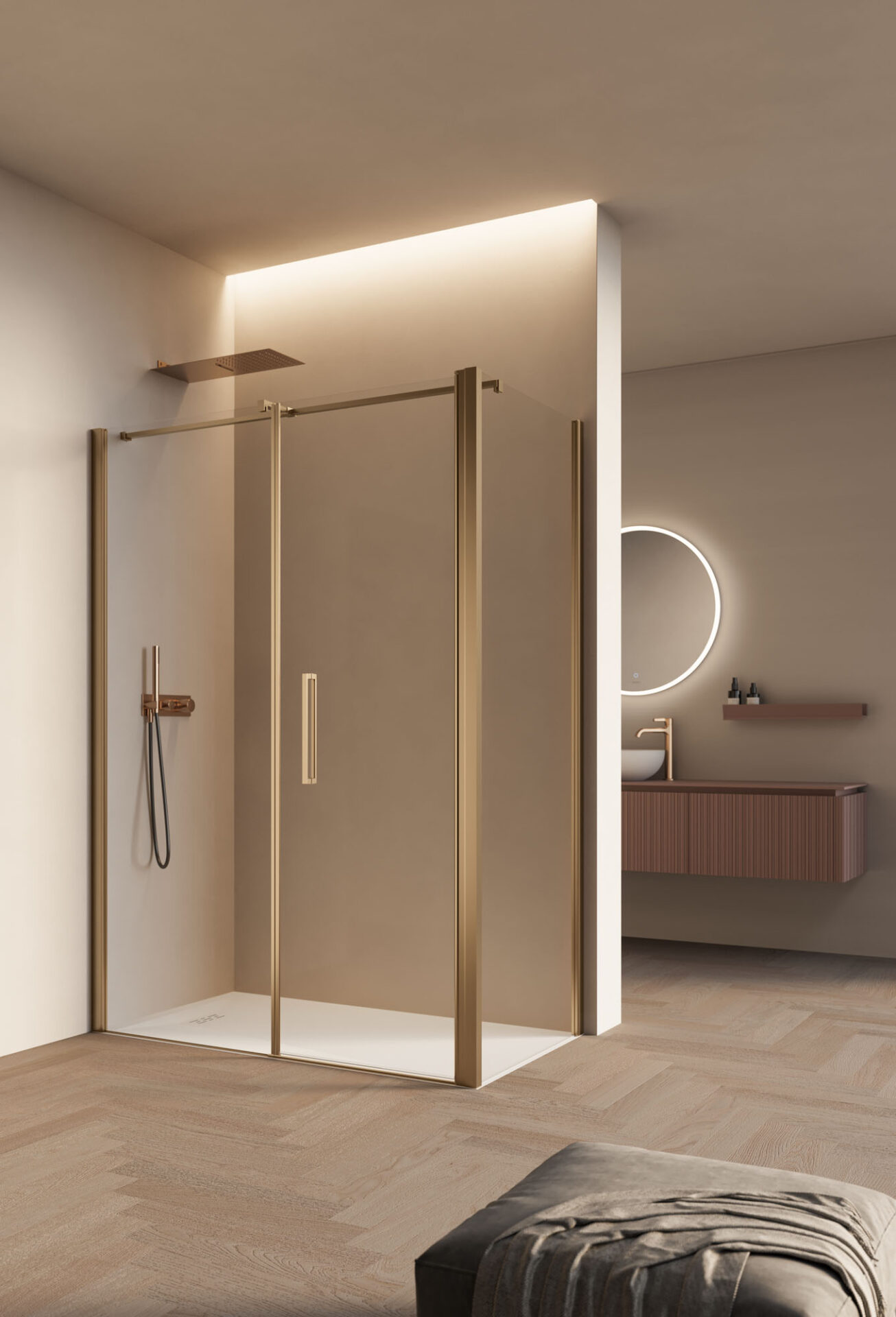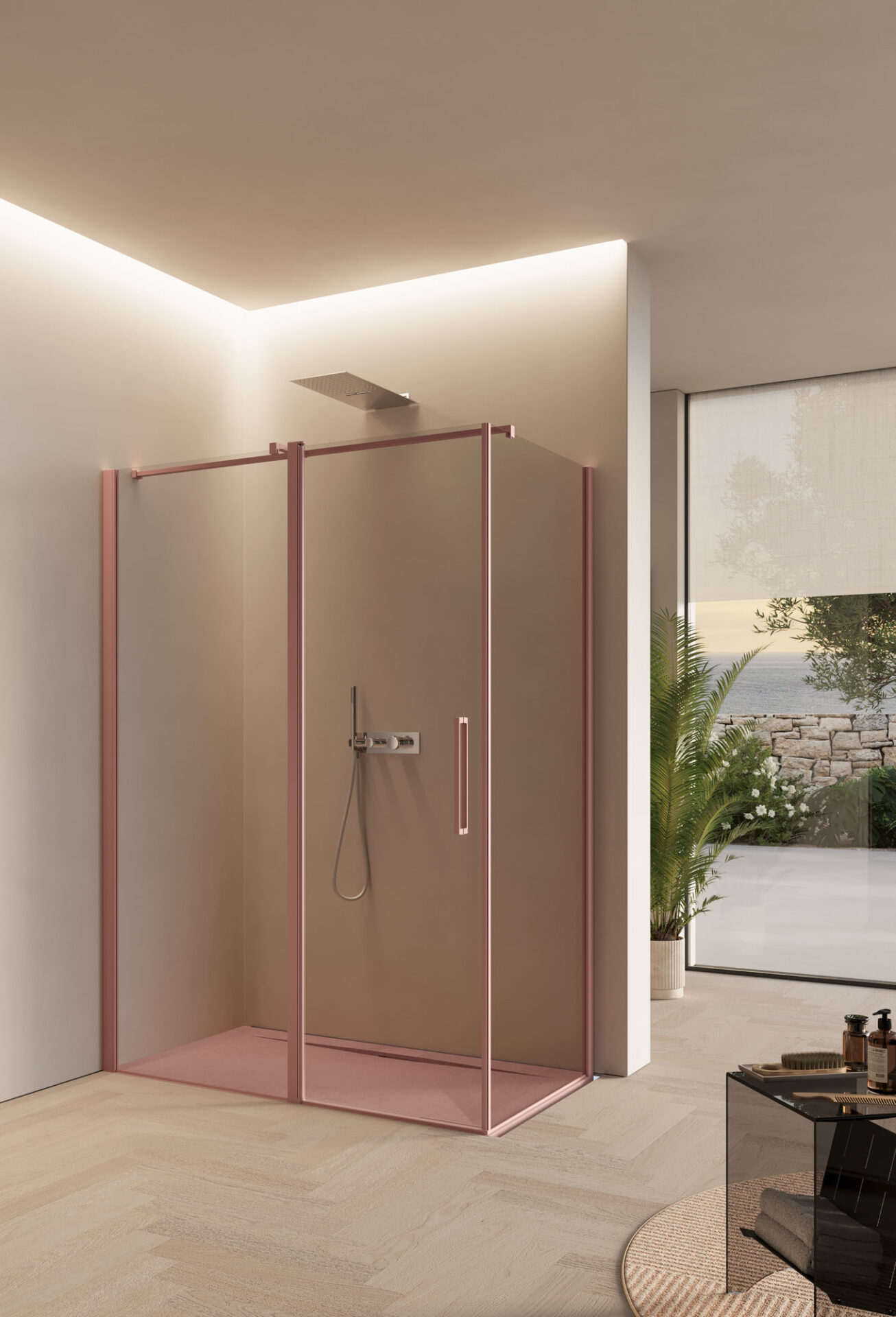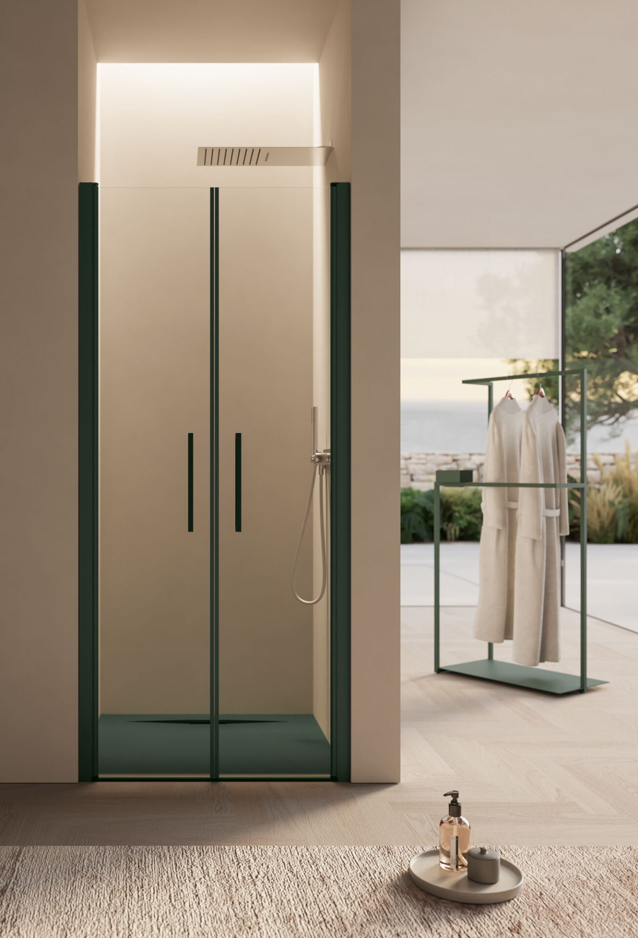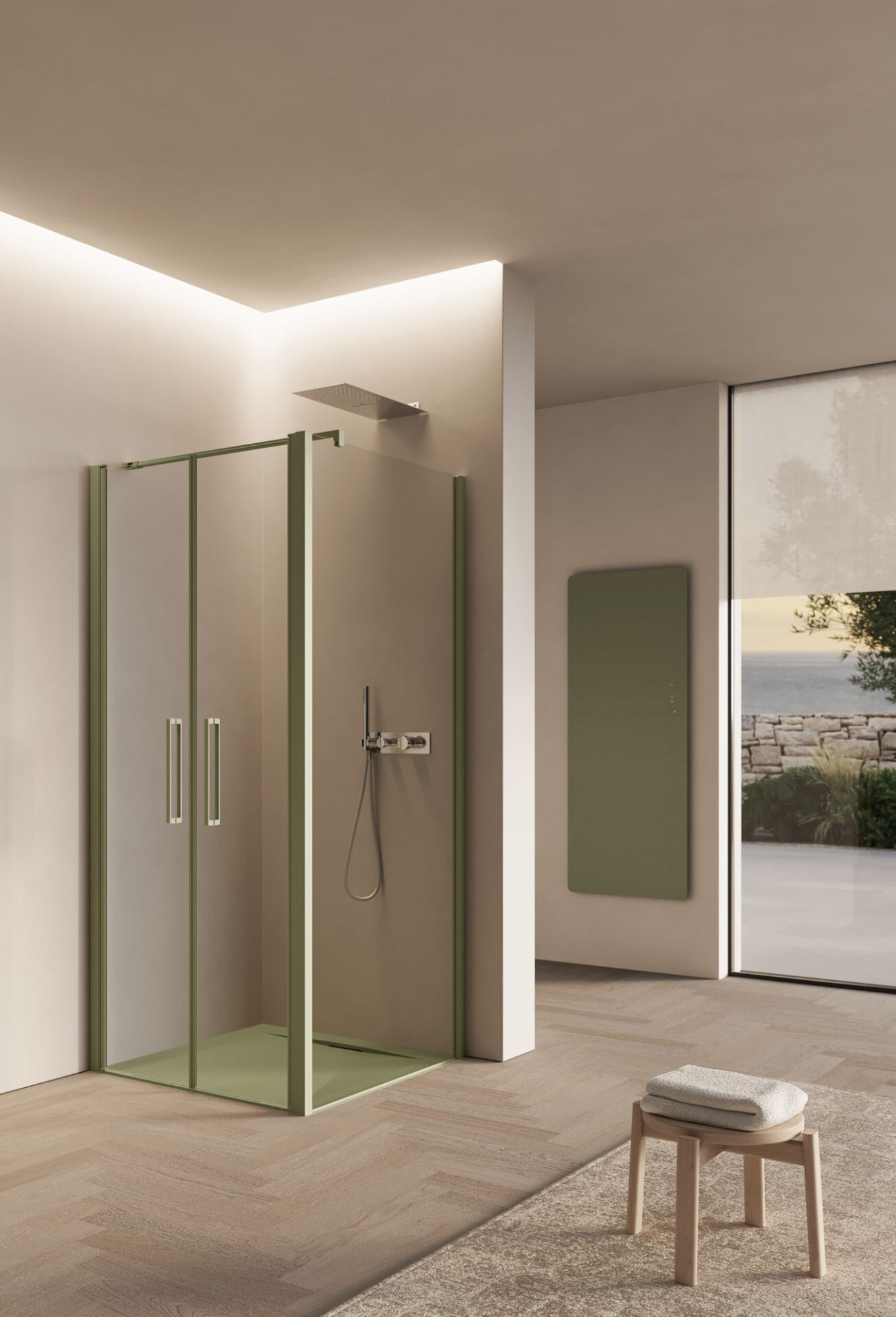 Die Duschkabine Omega mit Drehtür, Doppeldrehtür, Falttür oder Saloontür zeichnet sich durch ihre puristische Optik aus und ist in der Nische, in der Ecke, halbgemauert oder als Badewannenaufsatz erhältlich.