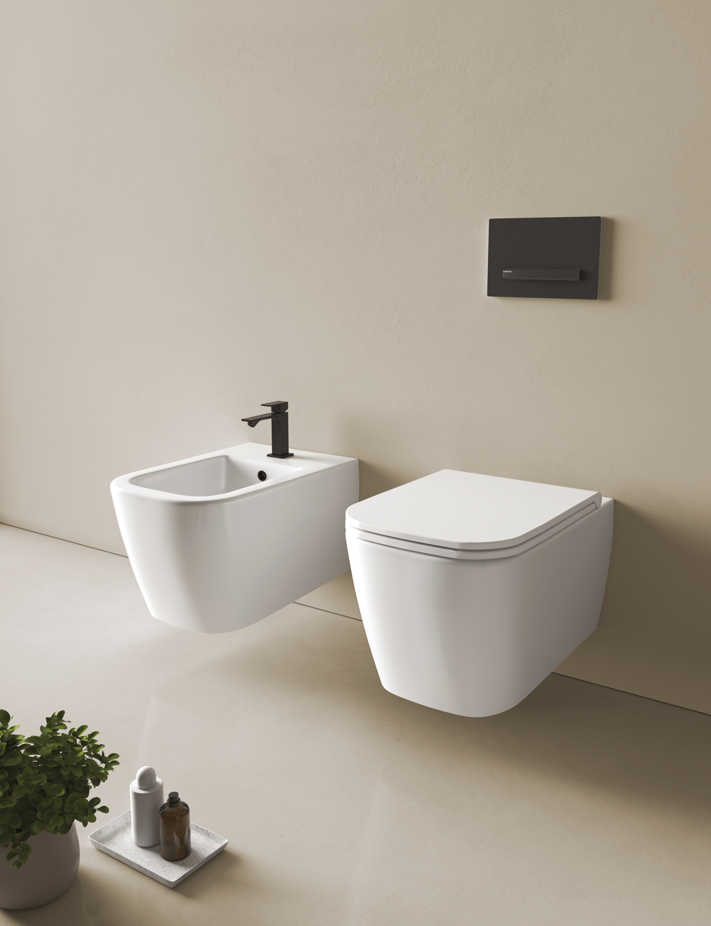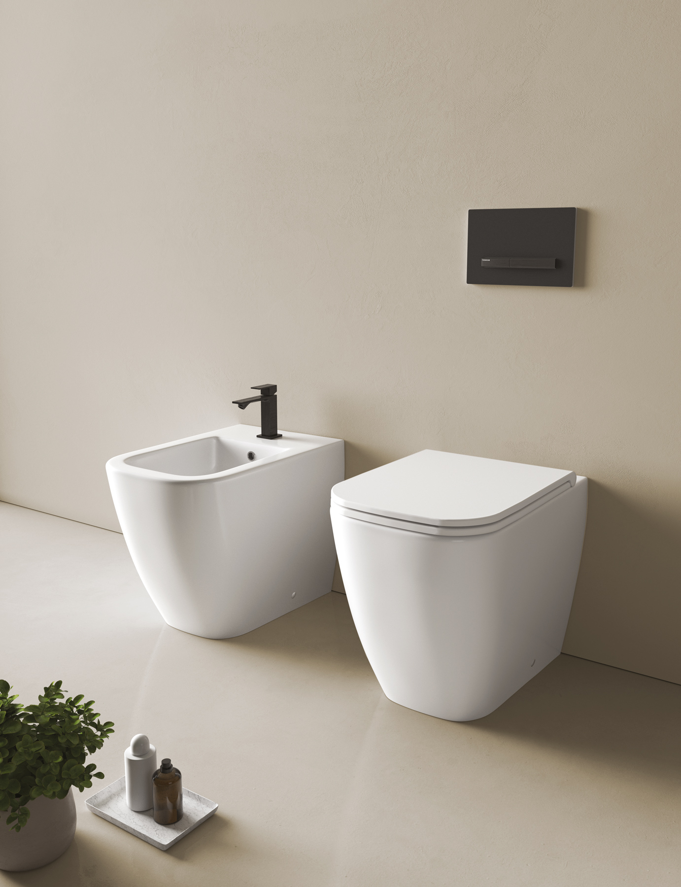 Kompakte oder geschwungene Formen prägen das Aussehen von Teo, der wandhängenden oder bodenstehenden Sanitärkeramik in Bianco matt.