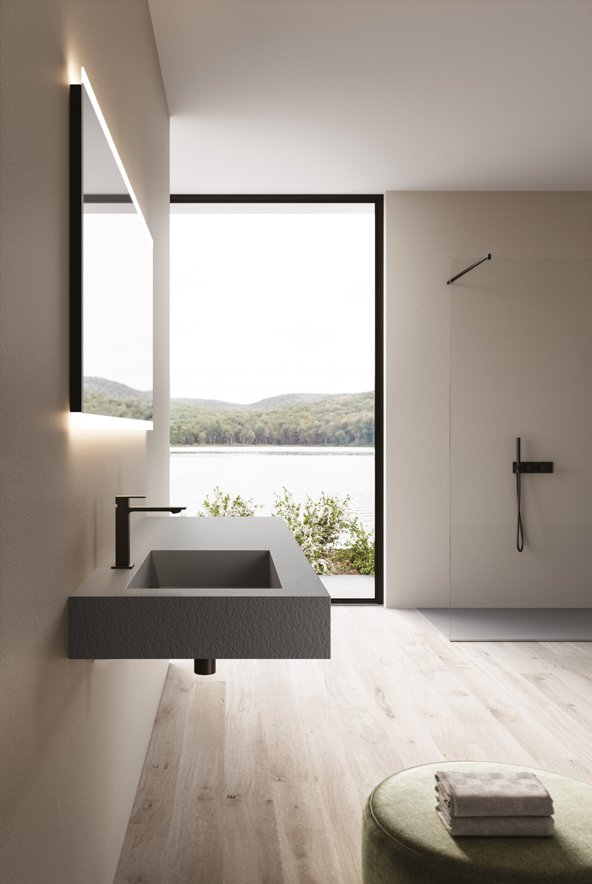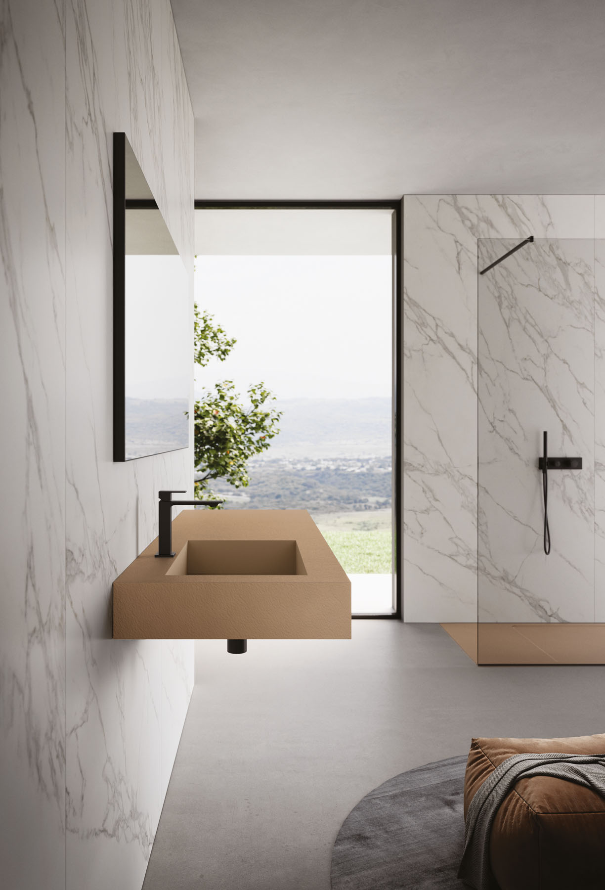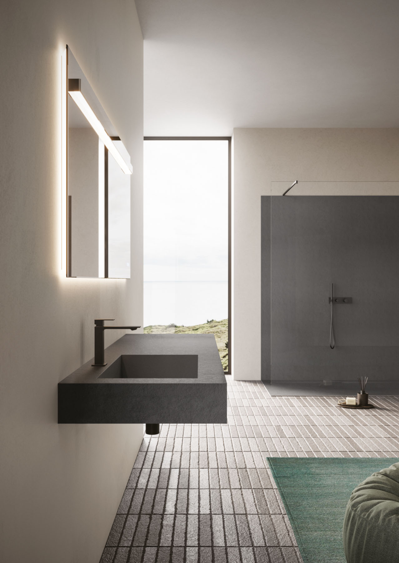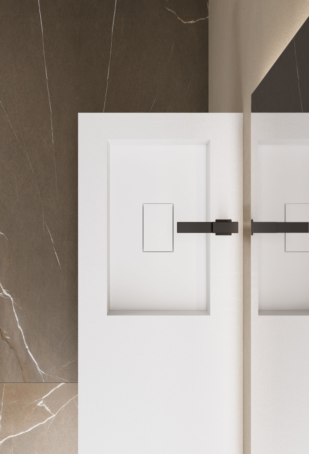Die Textur und die Farben der Duschwannen aus Tecnogel (Dual, Luna, Piano, Join, Nolita, Krus, Open) können auf die Hohlkern-Waschtischplatte mit integriertem Waschbecken, auf die Wandverkleidungen, auf die Deckplatten der Badschränke und den Designheizkörper Helios abgestimmt werden.