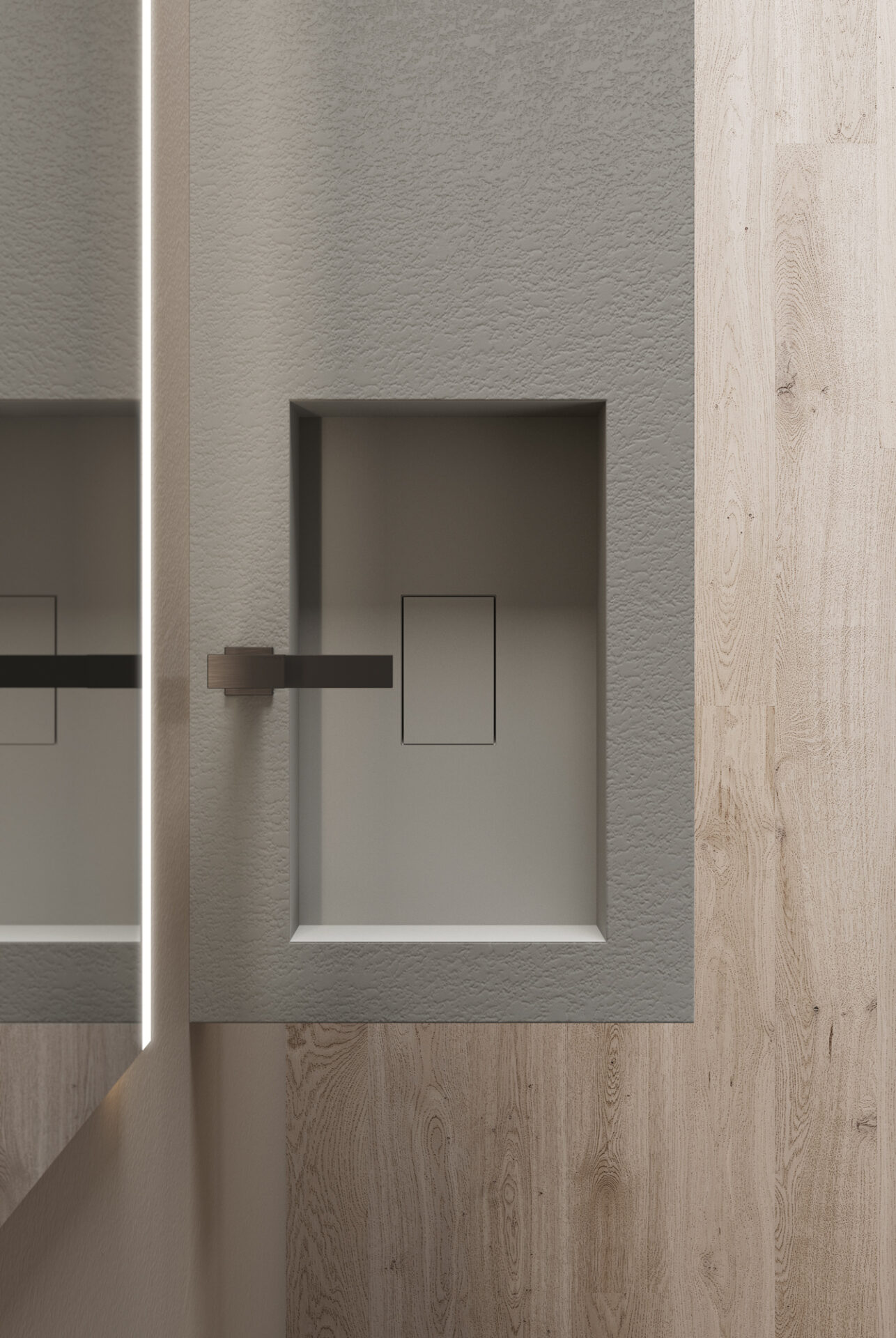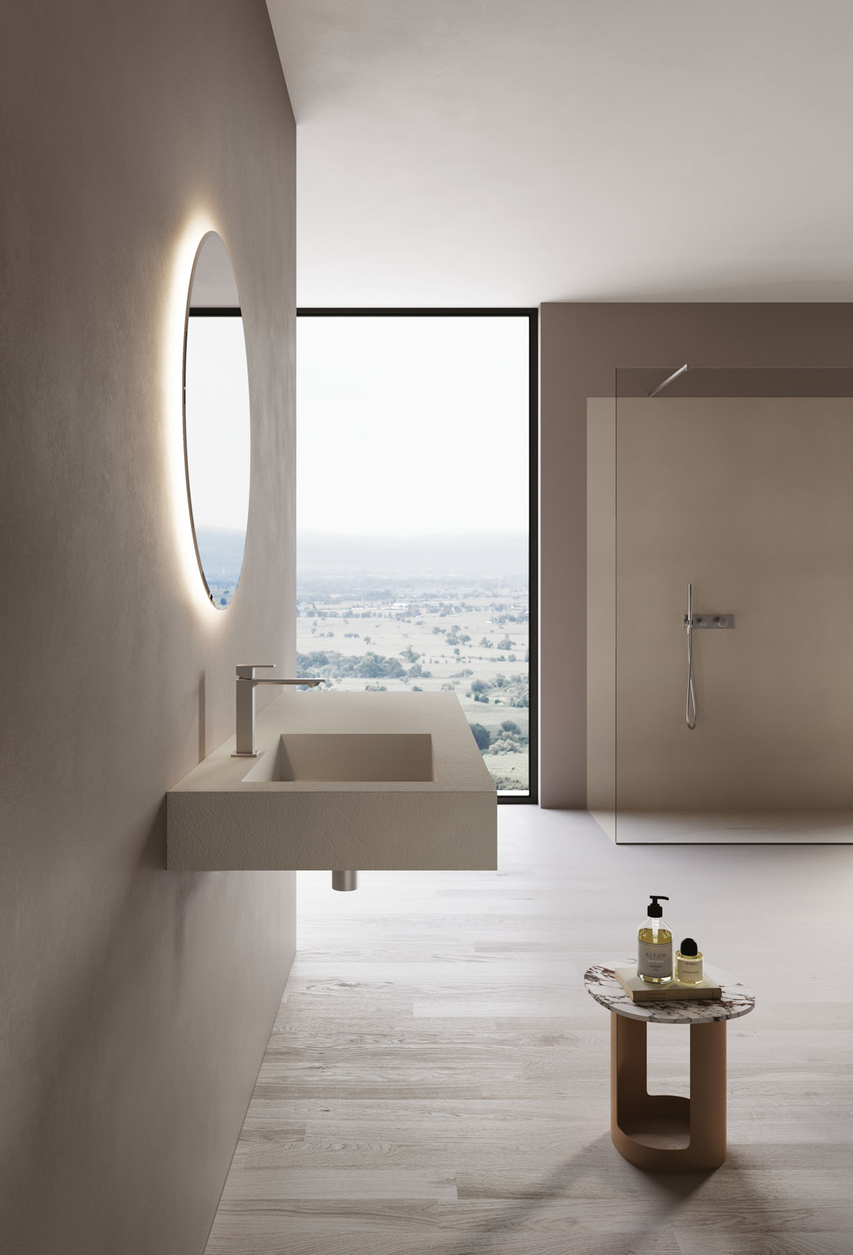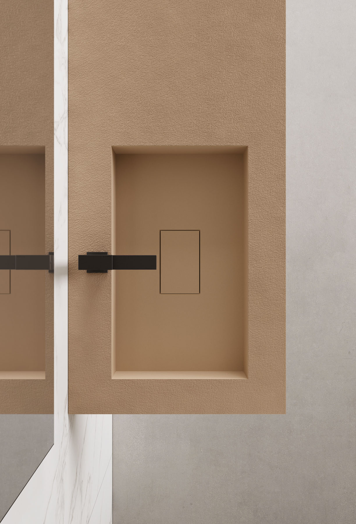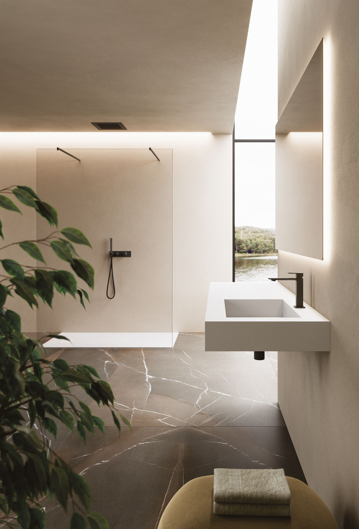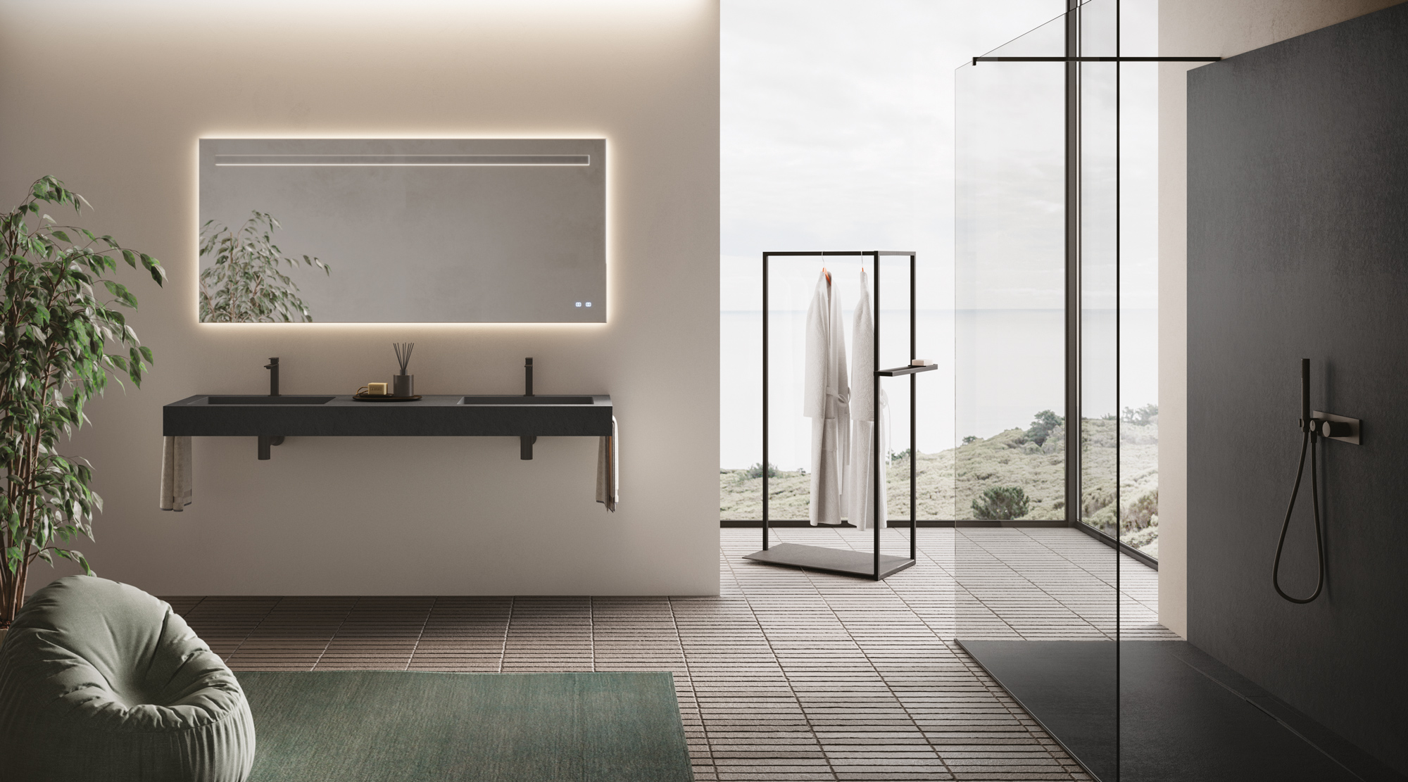 Die Textur und die Farben der Duschwannen aus Tecnogel (Dual, Luna, Piano, Join, Nolita, Krus, Open) können auf die Hohlkern-Waschtischplatte mit integriertem Waschbecken, auf die Wandverkleidungen, auf die Deckplatten der Badschränke und den Designheizkörper Helios abgestimmt werden.